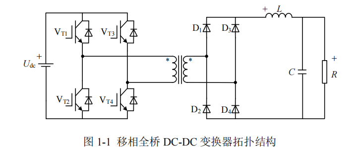 其中 Udc 是直流供电电源,VT1-VT4 是带续流二极管的 IGBT,接高频变压器 D1- D4 构成全桥整流电路,L 为滤波电感,C 为滤波电容,R 为直流负载。