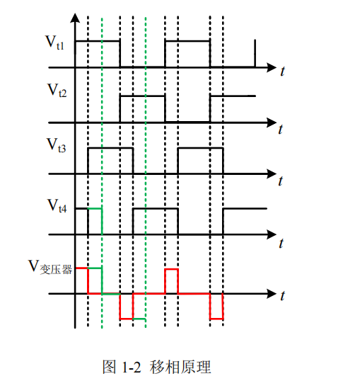 当直流输入电源进入开关管时,进行逆变,通过高频变压器再经过整流管从而再变为直流电,从而实现 DC-DC 的变换。IGBT 的控制采用 PWM 方式,将输出电压 与指定电压进行比较,实现闭环控制。原边 IGBT 的工作状态可有如下几个状态。1、 4 导通原边电压为正,2、3 导通原边电压为负,1、3 或 2、4 导通,原边短路电压为 0。
