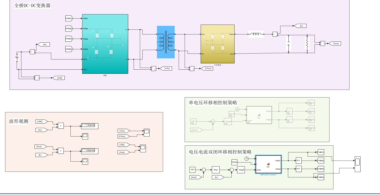 整理了全桥DC-DC变换器的移相控制策略simulink仿真模型,采用移相单电压环控制策略和移相电压电流双闭环控制实现稳压输出。附赠对应的仿真pdf文件。
