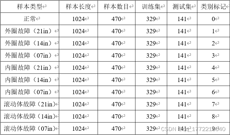 采用凯斯西储大学(CWRU)轴承公开数据样本进行实验分析,选取48K采样频率不同负载下的故障轴承振动数据对模型进行测试。滚动轴承的健康状态可分为10类, 本次实验测试样本选取用1 hp 下 10 种故障状态振动信号,构建数据集,每类样本长度为1024,其中,随机选择70%的样本作为训练集对模型进行训练,30%的样本作为测试对模型进行测试。具体信息如下。