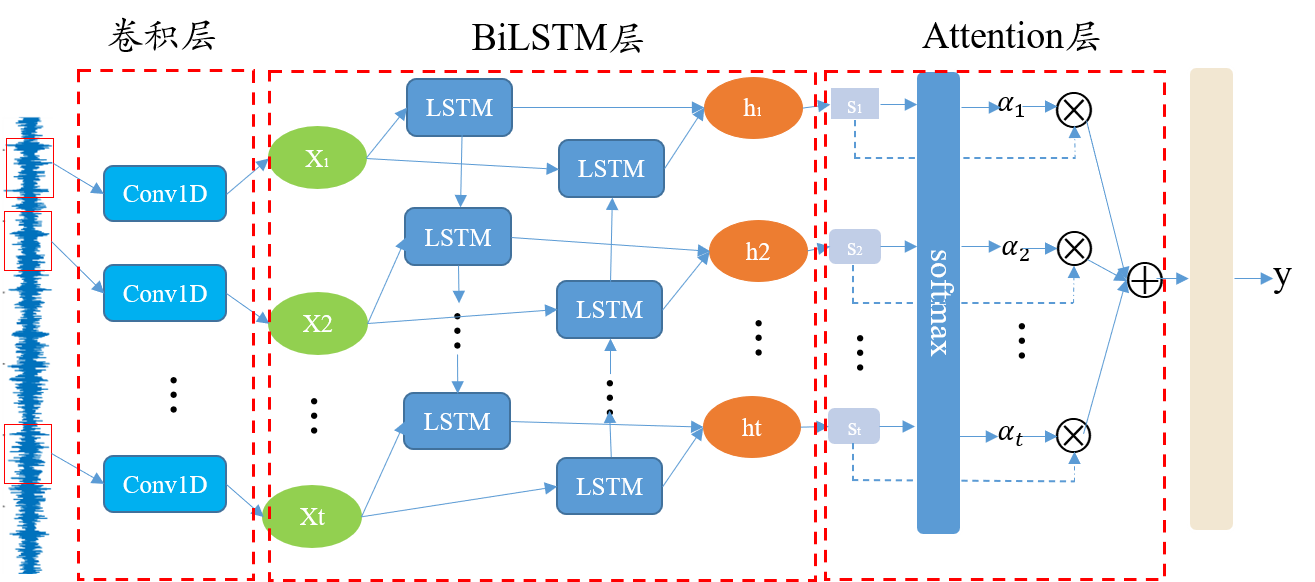 本次的混合神经网络故障诊断模型主要由CNN层、BiLSTM层、注意力层组层以及softmax层组成,模型结构如下所示。