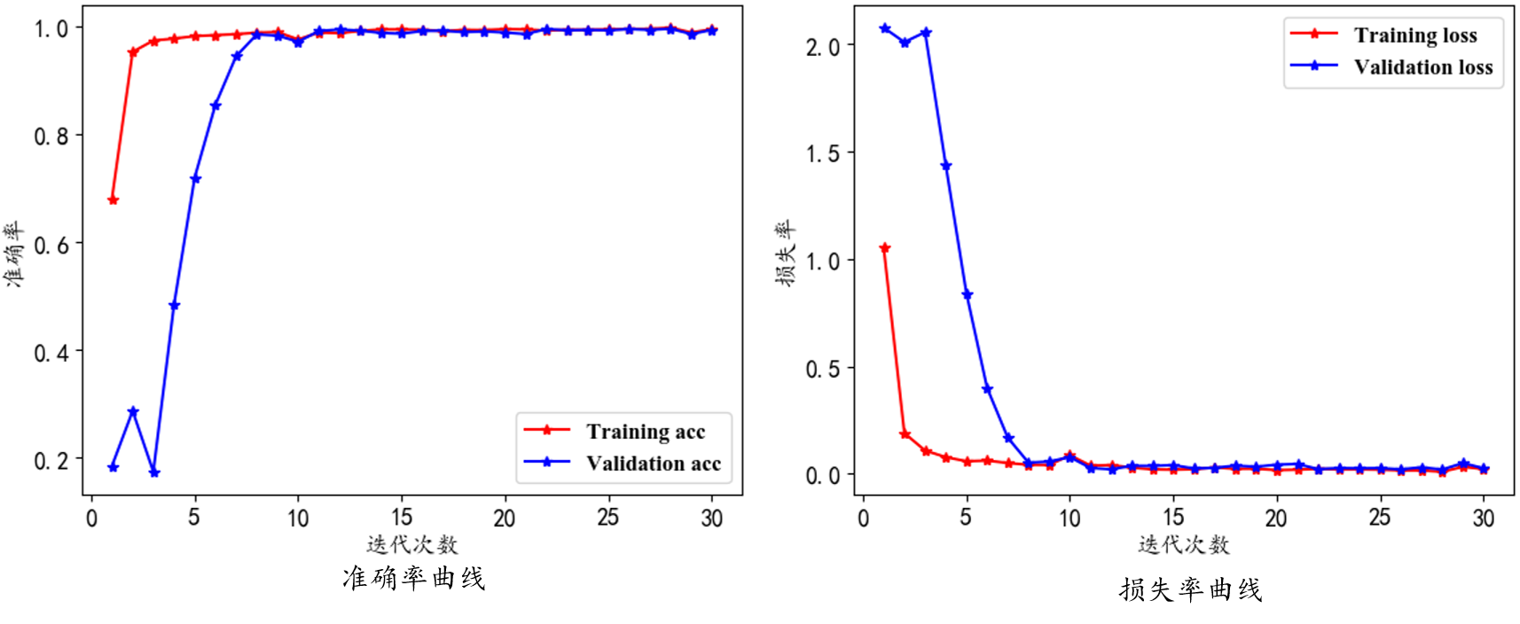 使用创建的数据集对模型进行训练,同时保存训练好的模型,模型训练过程中的准确率曲线和损失率曲线如下图所示。从图中可以看到,模型训练效果良好,没有出现过拟合现象。