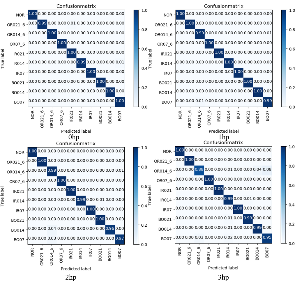 为了细化模型的故障诊断情况,分别使用0hp、1hp、2hp、3hp负载下的数据对模型进行测试,并采用混淆矩阵来表示故障诊断结果。