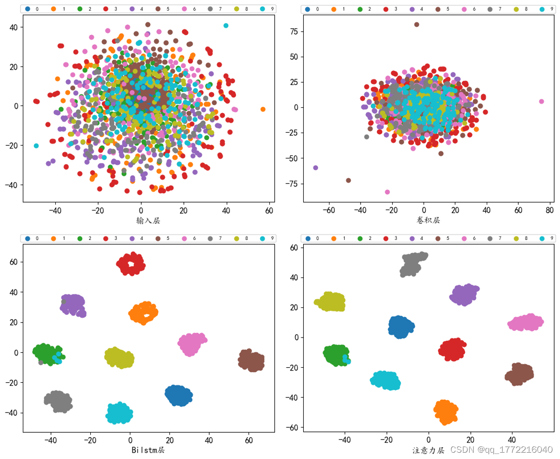 输入层为时域信号的t-SNE可视化结果,不同健康状态的数据相互混合在一起,聚类效果极其差。从卷积层的t-SNE可视化结果可以看到,部分同类样本已经有了开始聚合的趋势,随着网络层的深入,BiLSTM第二层的t-SNE可视化结果大部分样本已基本完成了分类,只有少部分的样本混在其他类型的样本中,最终在注意力层聚类效果更加明显,与上图混淆矩阵的结果相符,也证明了该模型具有优越的诊断能力。