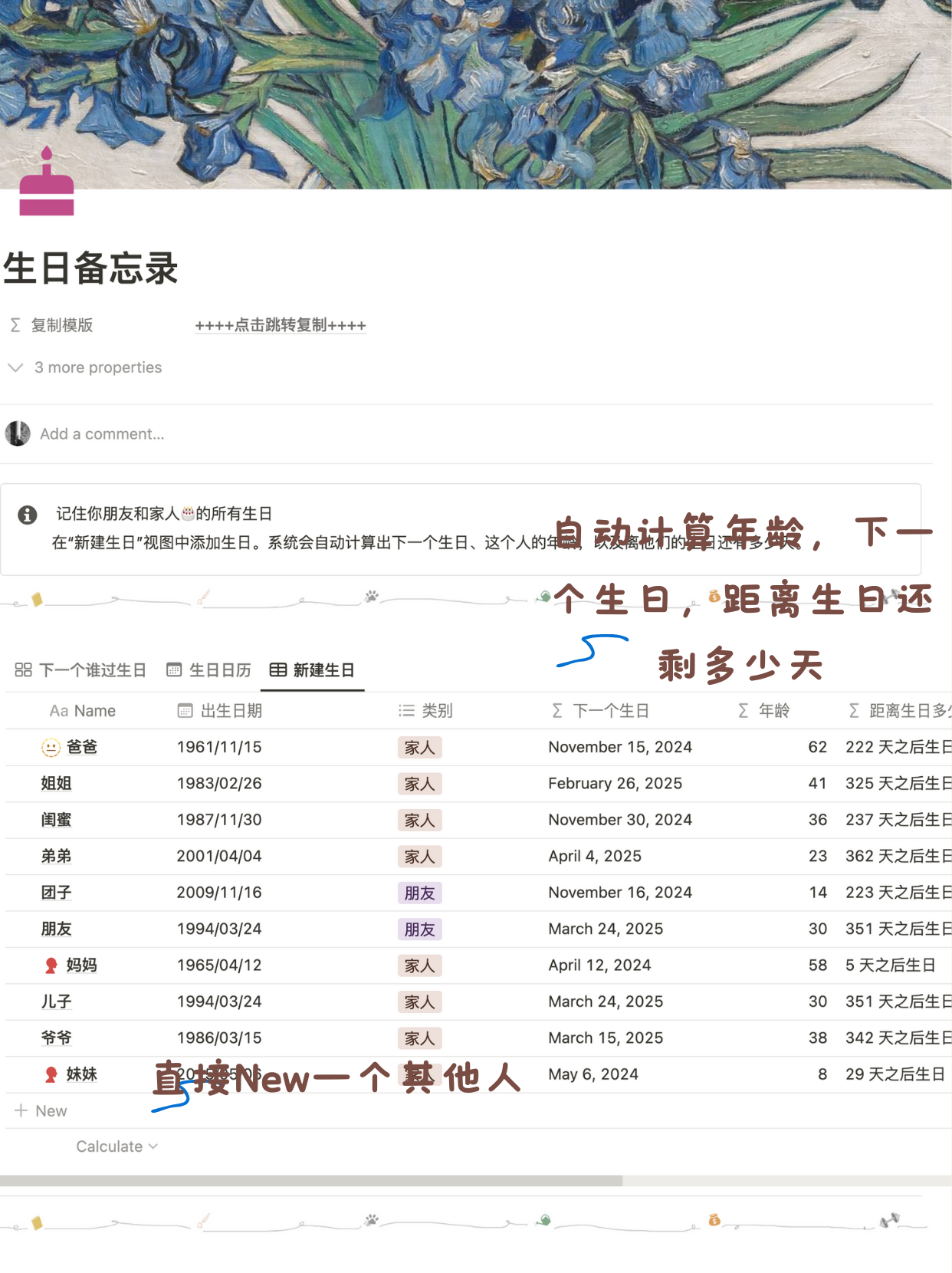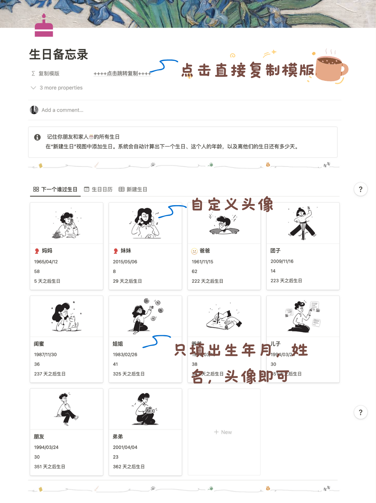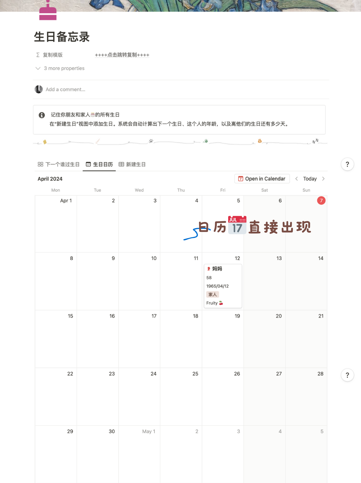 3️⃣ 年度视图展示 - 利用Notion的日历视图或数据库功能,直观展现全年生日分布,提前规划月份预算和礼物购买计划。