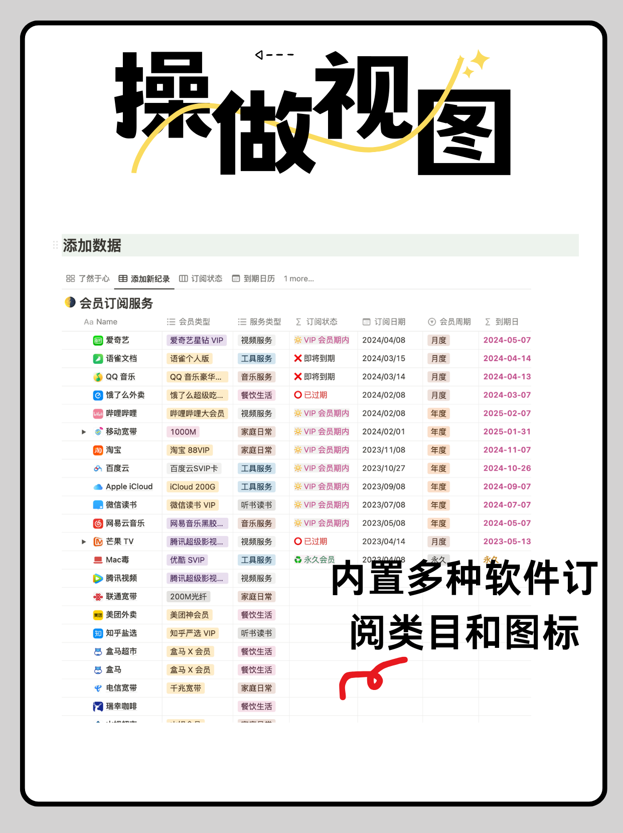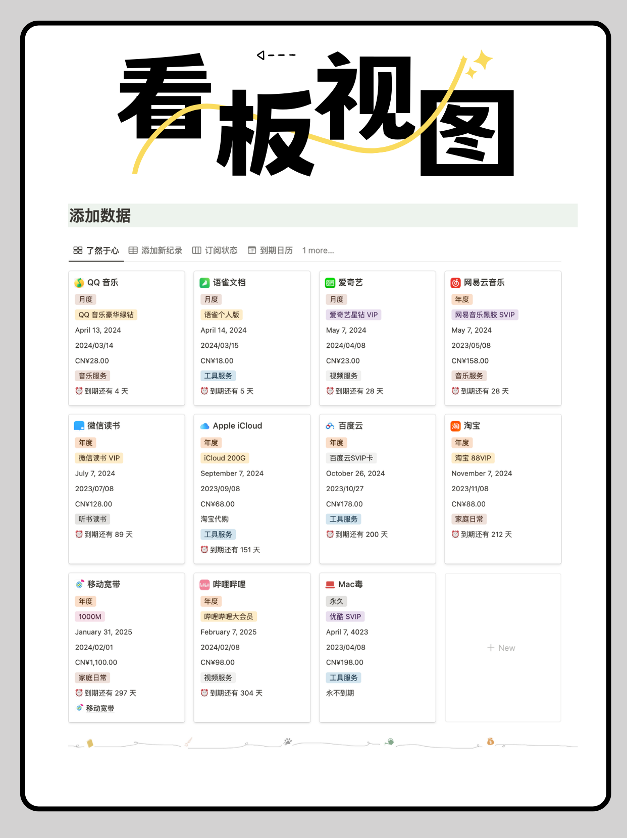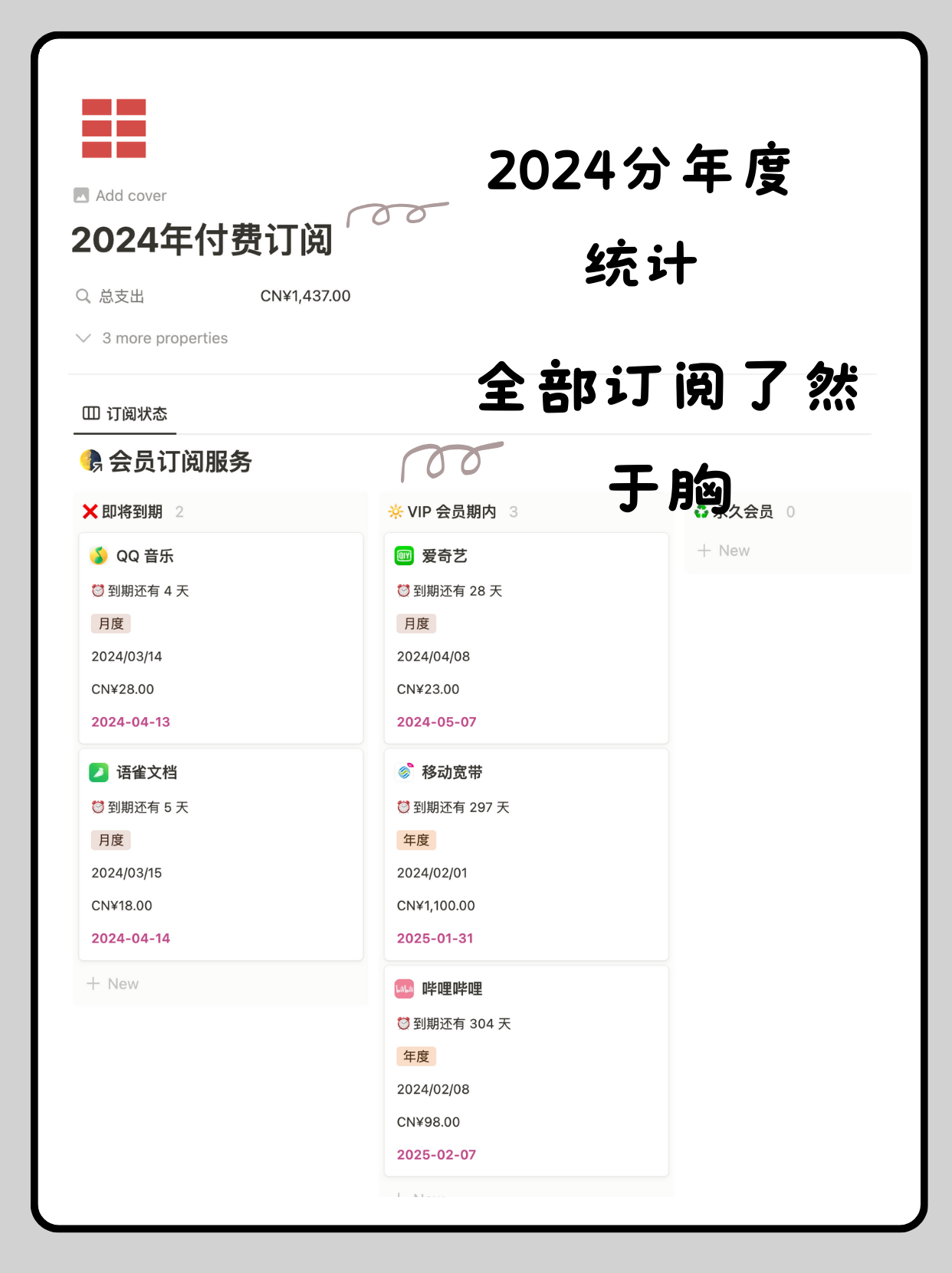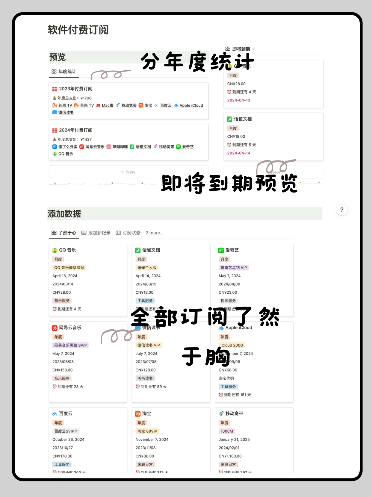 在信息化时代,我们订阅了众多软件服务,从办公生产力工具到娱乐流媒体平台,它们极大丰富了我们的生活与工作,但也带来了跟踪管理上的困扰。现在,借助Notion的超强定制能力,你可以拥有一个全能的年度订阅记录系统,实现对所有订阅条目的精细化管理,把握财务脉络,让每一笔支出都有据可查,有度可依。