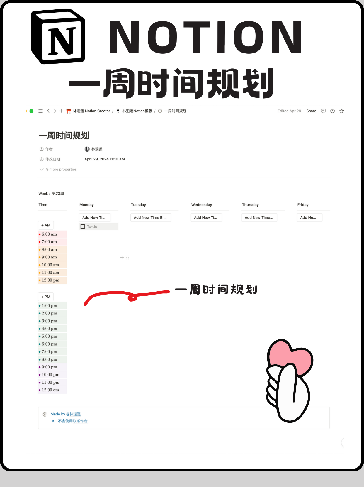 作品简介 高效的时间管理是实现个人目标与维持生活质量的关键。这是一份详尽的一周时间规划模版,帮助你合理分配时间,平衡工作、学习与休闲,确保每一刻都充满意义。 创作时间:2024-05-20 13:06:57