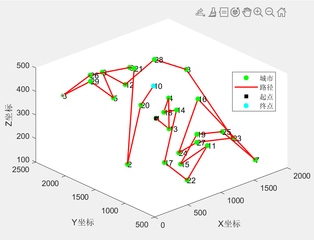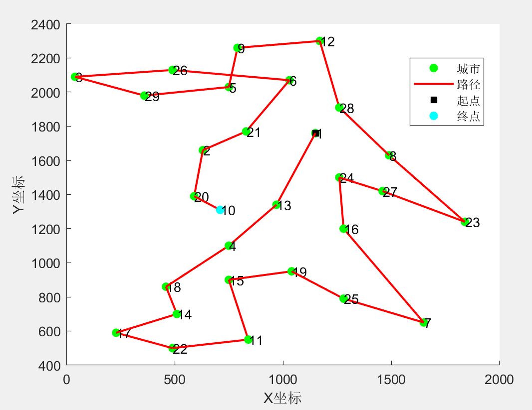 算法得到的路径:1 > 13 > 4 > 18 > 14 > 17 > 22 > 11 > 15 > 19 > 25 > 7 > 16 > 24 > 27 > 23 > 8 > 28 > 12 > 9 > 5 > 29 > 3 > 26 > 6 > 21 > 2 > 20 > 10