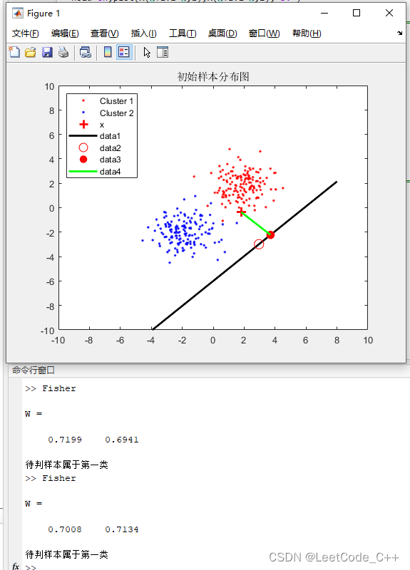 通过这些步骤,代码能够实现费舍尔线性判别分析,并对新的测试样本进行分类和可视化。