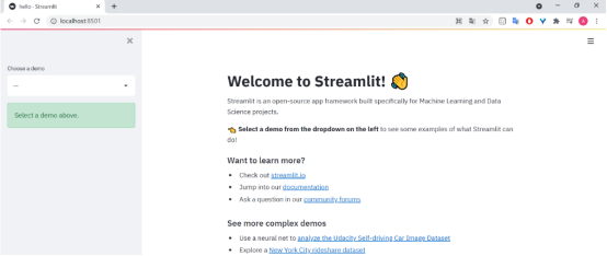 Streamlit 是一个开源应用程序框架,旨在简化为机器学习和数据科学构建 web 应用程序的过程。近年来,它在应用 ML 社区中获得了很大的吸引力。 Streamlit 成立于 2018 年,是前谷歌工程师在部署机器学习模型和仪表盘时遇到的挑战所带来的挫折。使用 Streamlit 框架,数据科学家和机器学习实践者可以在几个小时内构建自己的预测分析 web 应用程序。不需要依赖前端工程师或 HTML 、 CSS 或 Javascript 知识,因为这一切都是用 Python 完成的。一个简单的Streamlit初始界面如下图所示。