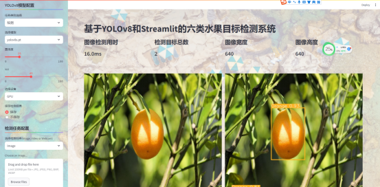 本文基于最新的基于深度学习的目标检测算法 YOLOv8对六类水果目标数据集 (苹果(apple)、香蕉(banan)、葡萄(grape)、橘子(orange)、菠萝(pineapple)和西瓜(watermelon)) 进行训练与验证,得到了最好的模型权重文件。使用Streamlit框架来搭建交互式Web应用界面,可以在网页端实现模型对图像、视频和实时摄像头的目标检测功能,在网页端用户可以调整检测参数(IoU、检测置信度等)。本数据集标注了苹果(apple)、香蕉(banan)、葡萄(grape)、橘子(orange)、菠萝(pineapple)和西瓜(watermelon)目标,且已转换成YOLO格式的标注文件。