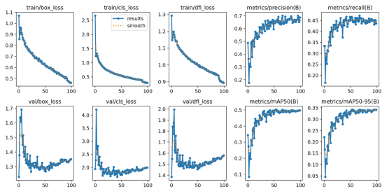 在实验结果与分析部分,我们使用精度和召回率等指标来评估模型的性能,还通过损失曲线和PR曲线来分析训练过程。在训练阶段,我们使用了前面介绍的数据集进行训练,使用了YOLOv8算法对数据集训练,总计训练了100个epochs。从下图可以看出,随着训练次数的增加,模型的训练损失和验证损失都逐渐降低,说明模型不断地学习到更加精准的特征。在训练结束后,我们使用模型在数据集的验证集上进行了评估,得到了以下结果。