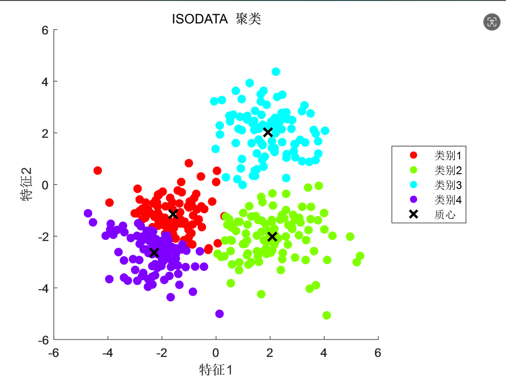 ISODATA(Iterative Self-Organizing Data Analysis Technique Algorithm)是一种经典的聚类算法,它是K-Means的一种改进版本,可以在数据聚类时自动调整聚类数目。在MATLAB中,我们可以使用kmeans函数来实现ISODATA聚类,可以按需求设置最大聚类数目、最小聚类数目、最大迭代次数、簇间最小距离、每个簇中最小数据点数。