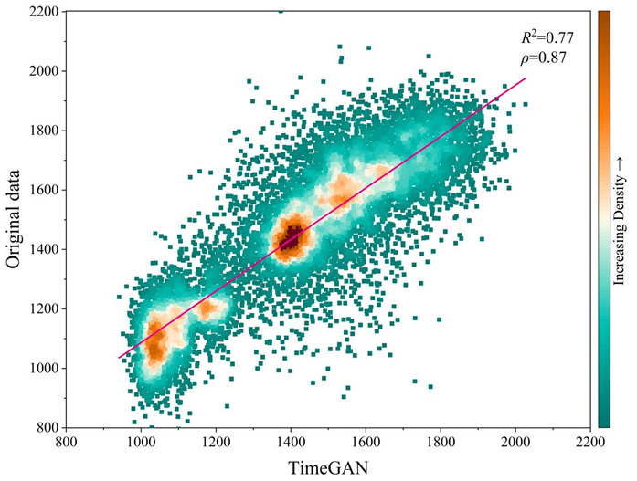 对TimeGAN生成负荷情景的合理性进行了检验。如图所示,TimeGAN生成的负荷情景数据与原始负荷数据间的皮尔逊相关系数系数(ρ)为0.87,表明生成数据与原始数据之间具有较强的相关性;R-Square(R2)的值为0.77,意味着TimeGAN很好的学习了原始负荷数据的特征,生成情景与原始情景间的拟合程度较好。此外,图中颜色梯度反映了数据点的密集程度,可以看出,TimeGAN生成的数据与原始数据的整体分布高度一致,在图中形成了明显的红色高密度区域。同时,数据点整体集中在红色拟合线两侧,说明TimeGAN生成的数据与原始数据在全局分布上没有明显的偏差。