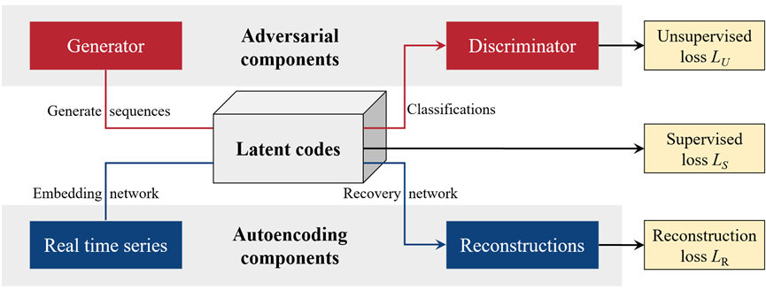 TimeGAN是基于GAN的变体,在解决时间序列数据的生成任务上相较其他GAN具有优势。当前,TimeGAN已被广泛地应用于复杂时间序列模拟,相较于传统GAN模型和第三代神经网络算法,TimeGAN在训练收敛速度和模拟精度上具有显著优势。对本文而言,鉴于负荷时间序列特征的复杂性,本文将该方法用于负荷侧情景集的生成。TimeGAN是一种黑箱模型,与传统的方法不同,无需事先对数据的分布做任何假设,仅需将大量历史负荷过程输入模型,TimeGAN会对历史负荷情景进行学习和训练后,自动合成新的情景过程。而在情景生成期间,TimeGAN还会主动调整自身的结构和参数,以最大程度地模拟复杂因素变化对于负荷曲线的影响。因此,相较于传统方法,TimeGAN可以更充分地考虑复杂因素对于负荷的影响,适用性更为广泛。