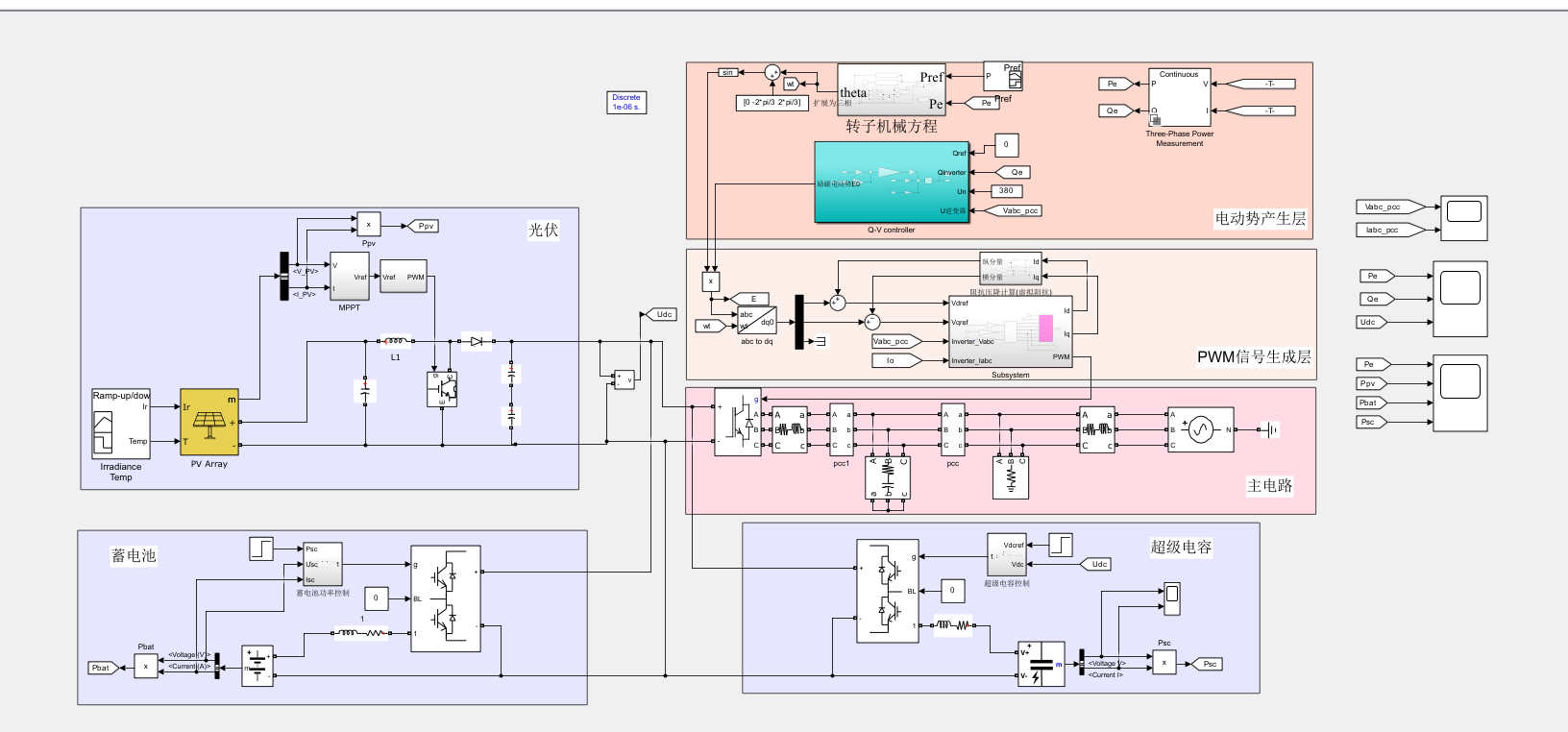 光伏储能参与一次调频、功率平抑、 直流母线电压控制;MPPT最大功率跟踪控制。