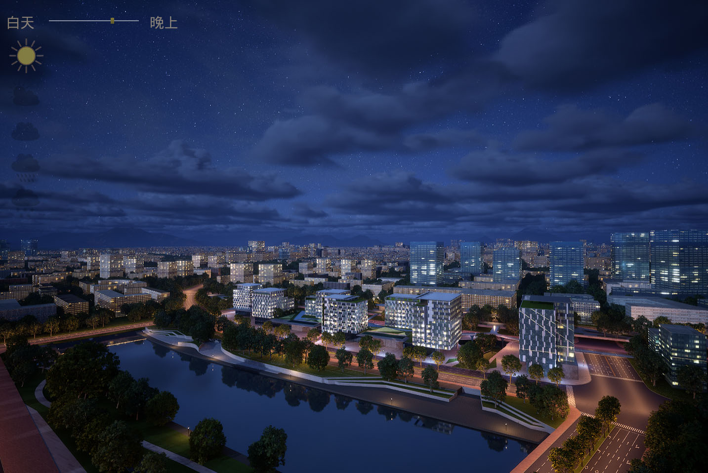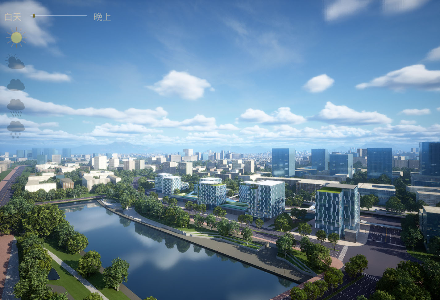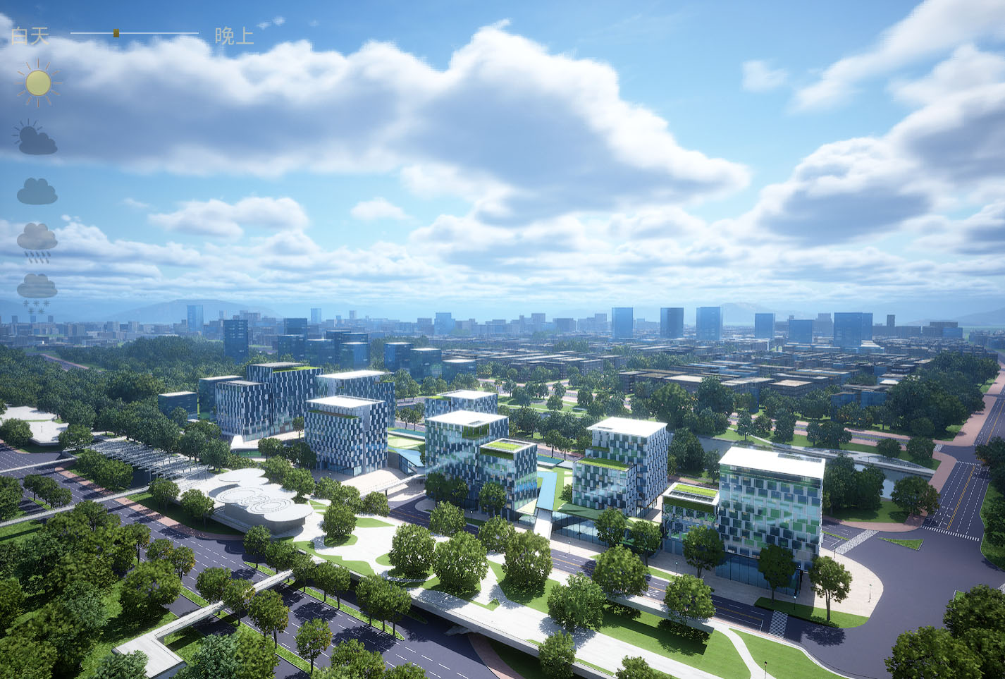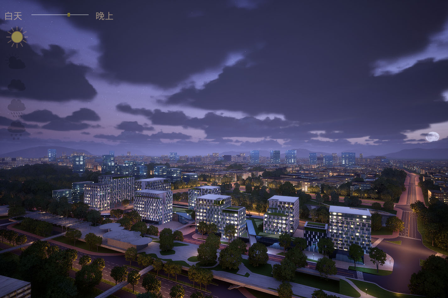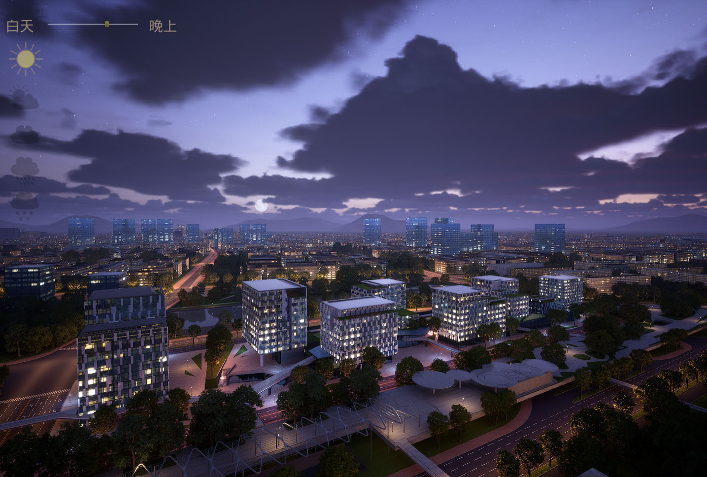 所见即所得,两个关卡,白天和白天到夜景的主关卡,主关卡运行后拖动时间滑条可以实现24小时时间变化,点击天气图标可以改变晴天,多云,阴天,下雨,下雪的天气变化,