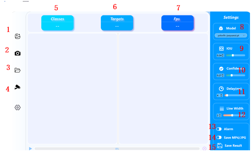 - 界面实时显示检测结果、类别数量、目标数量、FPS等