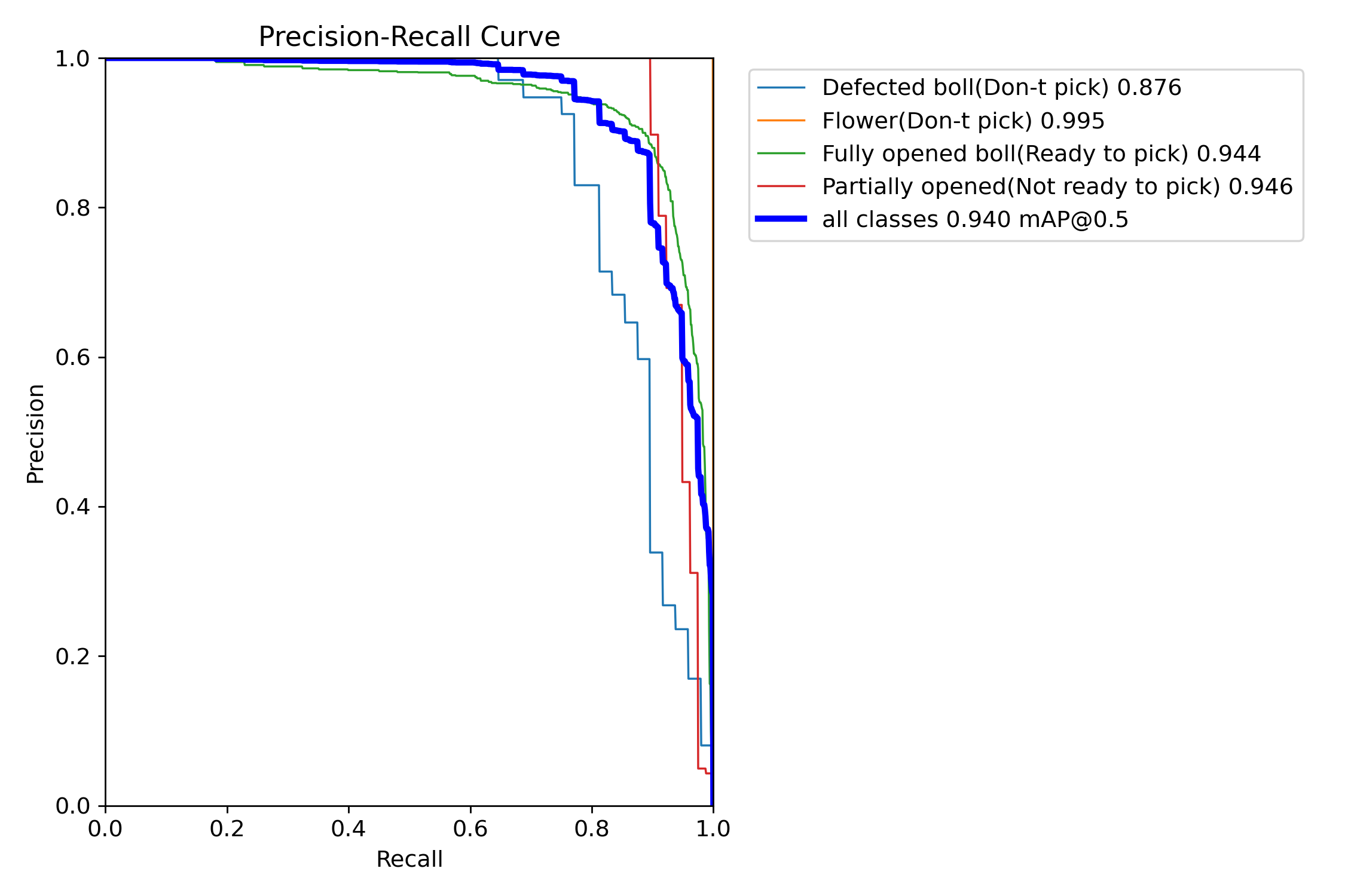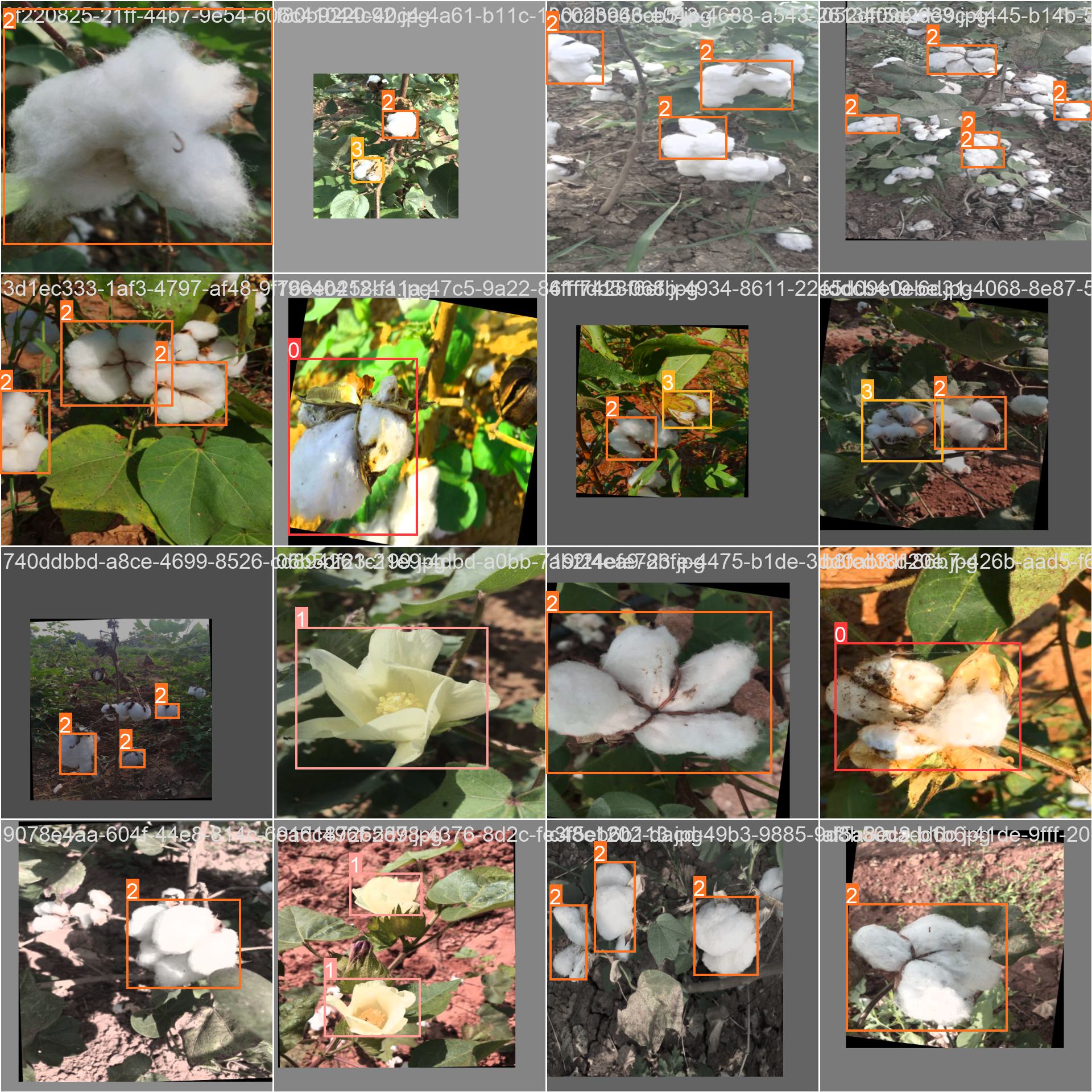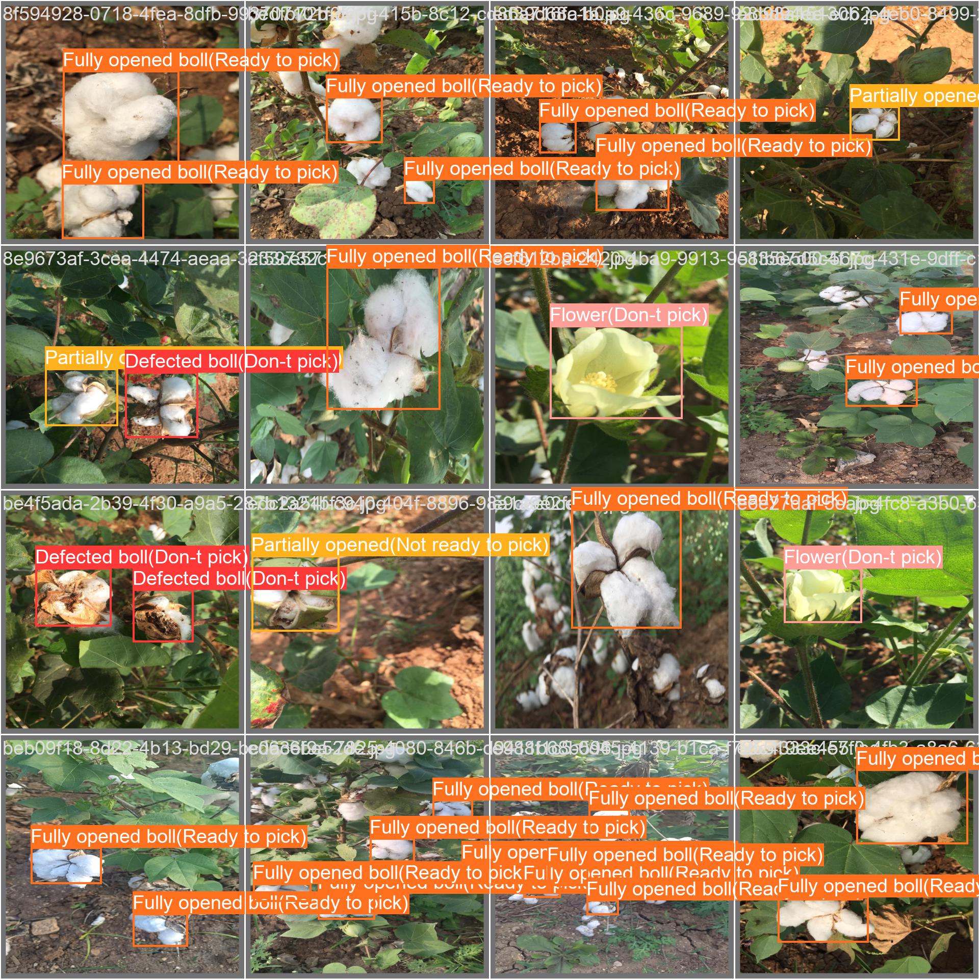 棉花成熟度数据集。数据集已经标注好,txt标注文件,yolo格式,适用于训练yolo5 8 9 10等yolo系列目标检测模型。数据集已经划分好训练集(12712张图片,含数据增强部分,分别是左旋15度,右旋15度,随机饱和度,即一张原图额外增强出3张图片)、验证集(529张图片,不含数据集增强)、测试集(530张图片,不含数据增强),数据集分为四类:有缺陷的(不采摘)、正在开花的(不采摘)、完全打开的(可以采摘)、部分打开的(不采摘)。包含类别标签文件。数据集标注准确,实测yolo10n map50为94%