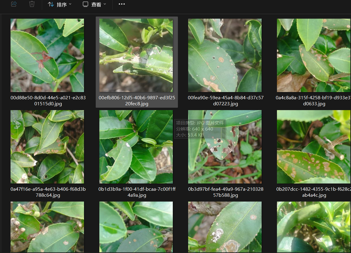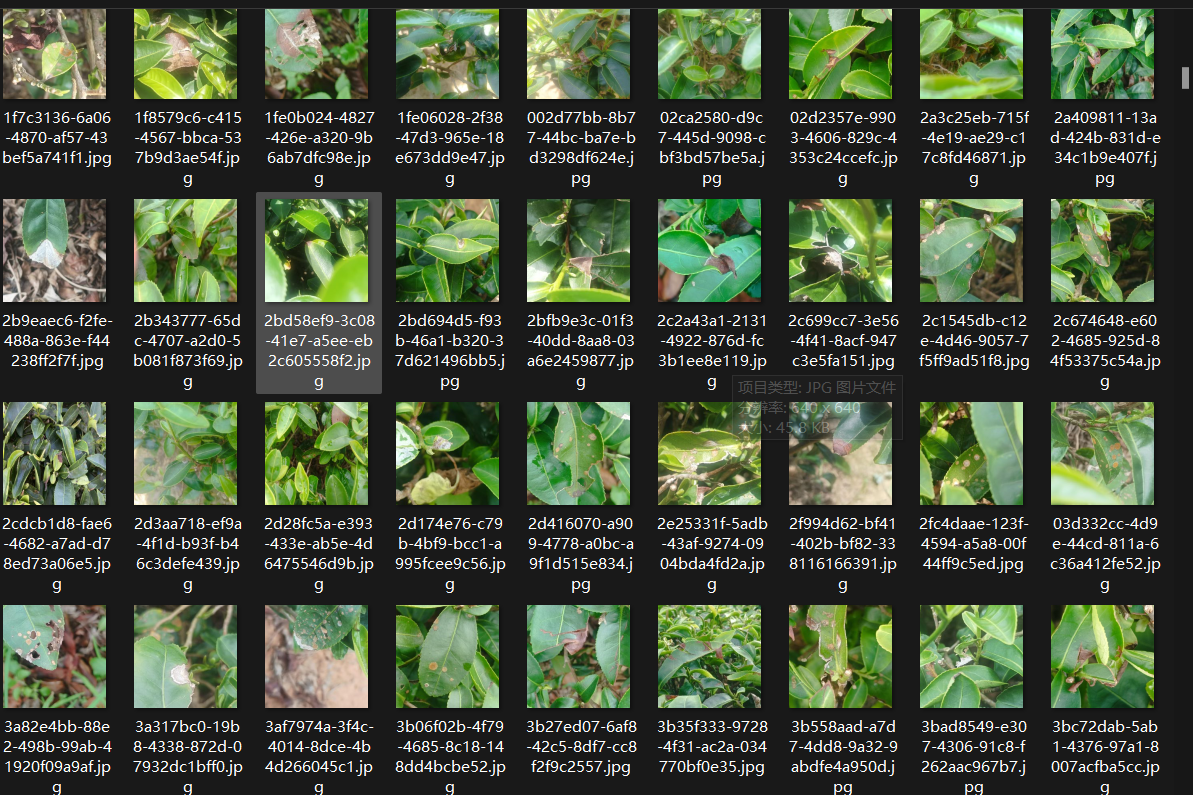 茶叶树叶片病虫害数据集。数据集已经划分好训练集(954张)验证集(199张)。数据集是标注好的,数据集是标注好的!!!txt格式。适用于训练YOLO系列目标检测模型。数据集类别包含三类:藻叶斑(algal leaf spot), 云纹叶枯病(brown blight), 灰枯病(grey blight)数据集图片均为原图不含任何数据增强后的图片,图片尺寸统一为640*640。