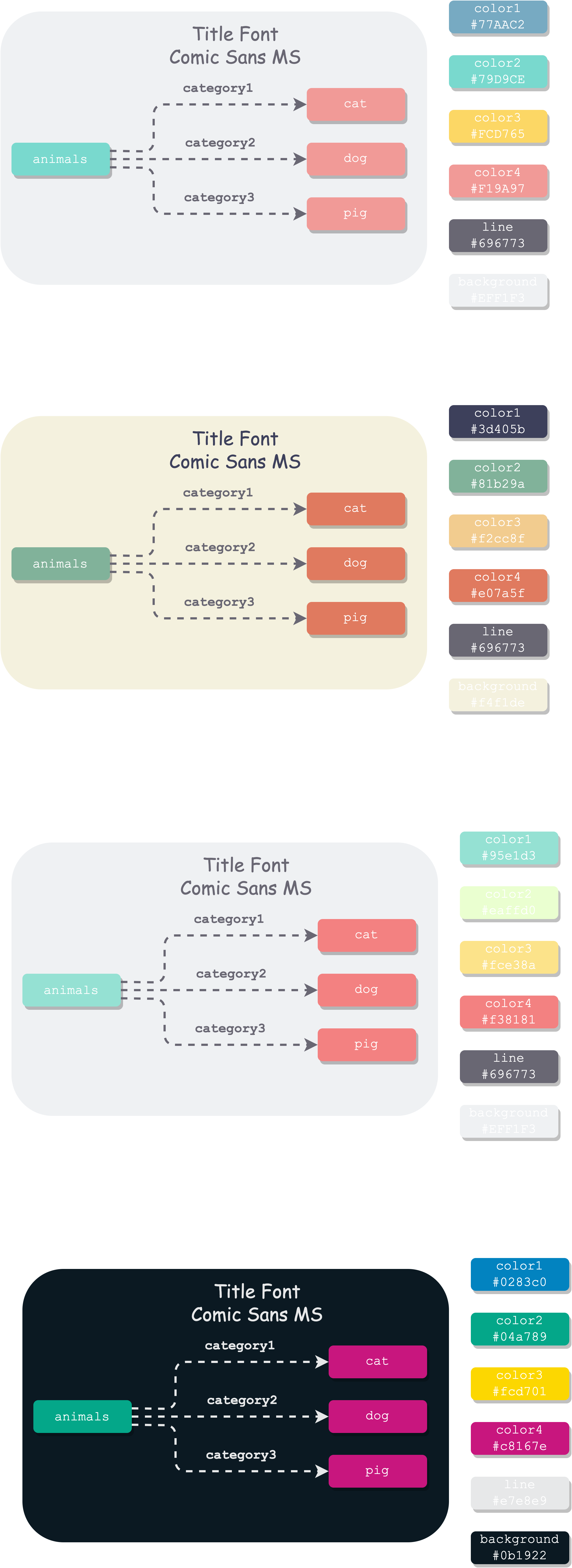 在此基础上,我又增添了三种配色方案,按喜好自选。每种方案由六种颜色组成,分别是四种图框配色方案(红绿黄蓝),一种线条/字体配色,一种背景色。