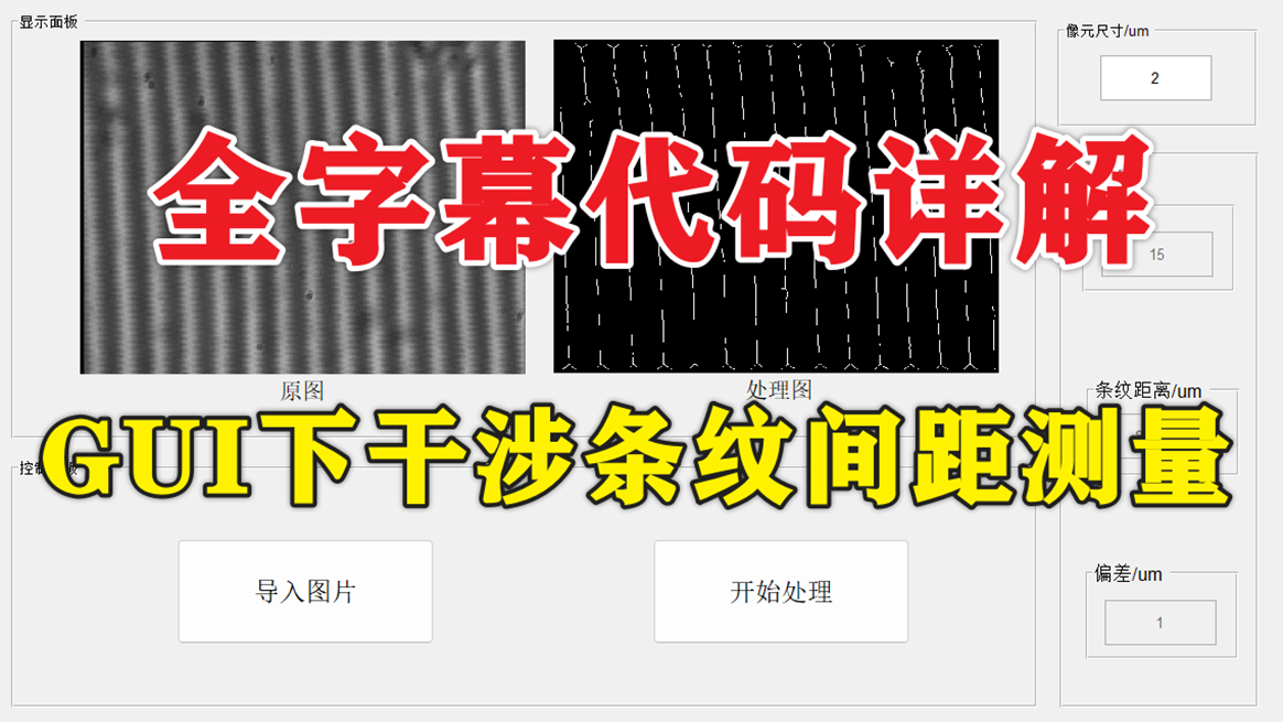 基于Matlab的干涉条纹间距测量。滤波:使用高斯滤波器对图像进行平滑处理。二值化:根据图像的灰度阈值将图像转换为二值图像。骨架提取:使用形态学操作提取图像的骨架。提取骨架位置:计算骨架的像素位置,并存储在矩阵B中。计算骨架间位置差:计算骨架像素之间的差异,并存储在矩阵C中。去除干扰项:通过统计和筛选方法去除偶然误差和干扰项。输出结果:将处理结果输出到编辑框中,并显示在GUI的特定区域。程序已调通,可直接运行。