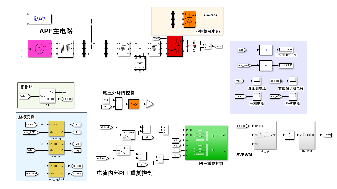 1、电路拓扑为三相全桥型、采用并联型APF有源电力滤波器、谐波检测采用瞬时idiq原理方法、APF直流侧电压采用PI控制,稳定性好;