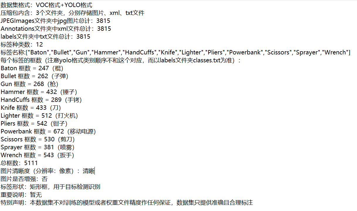 【目标检测】X光安检危险品数据集3815张12类YOLO+VOC格式