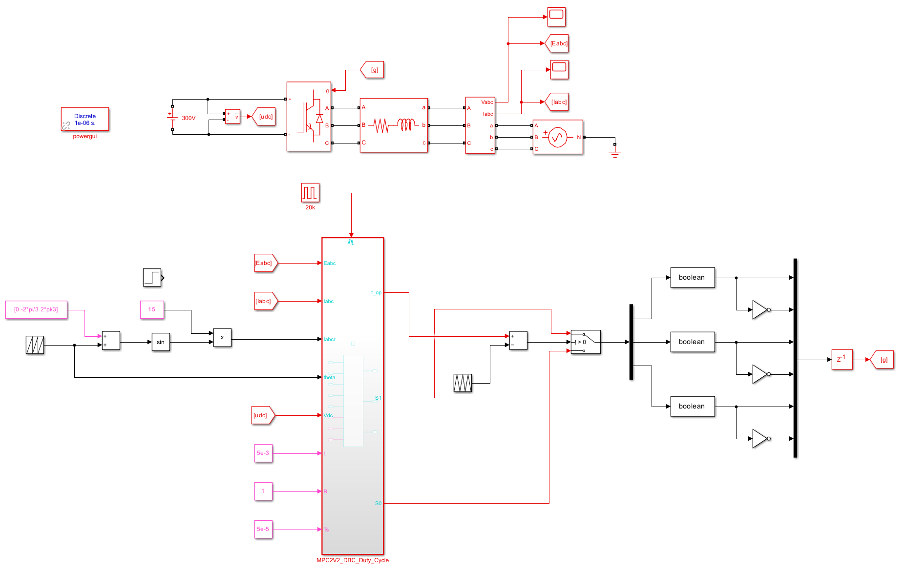 实现功能:给定参考电流,实现电流跟踪。在一个控制周期内应用两个电压矢量,两个矢量的作用时间根据无差拍控制方法计算。