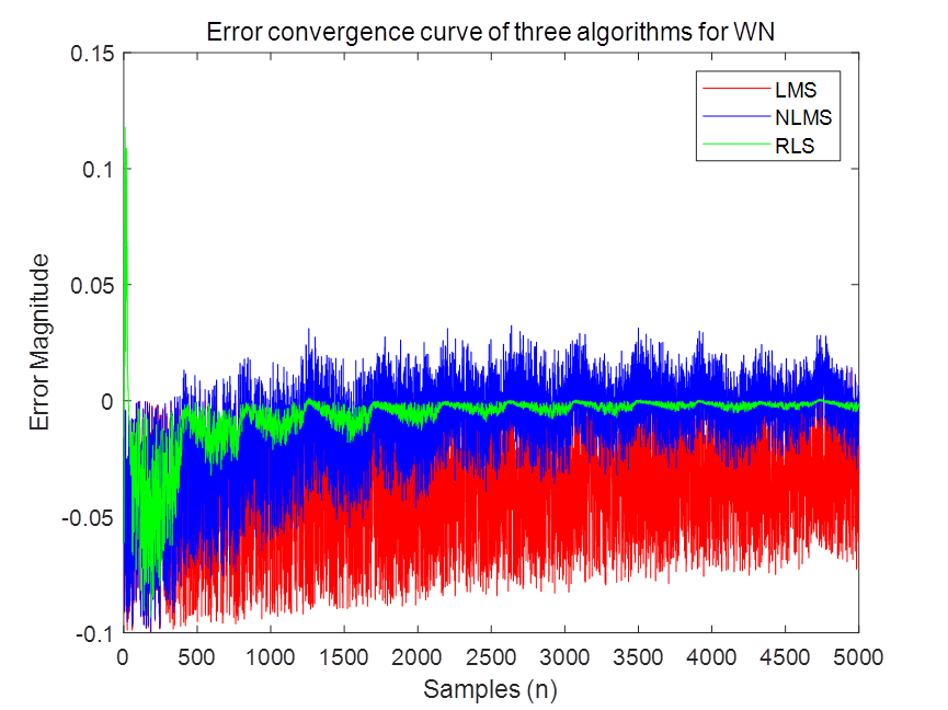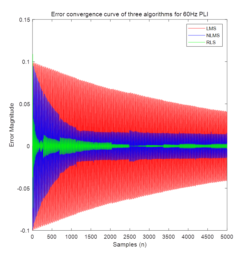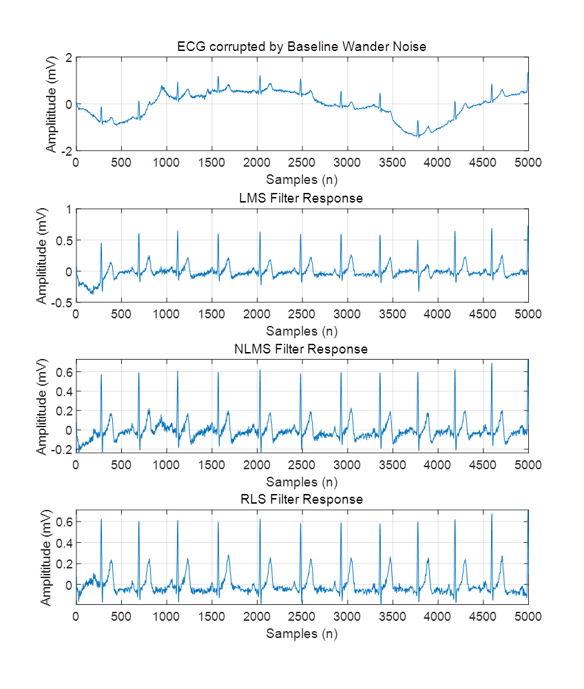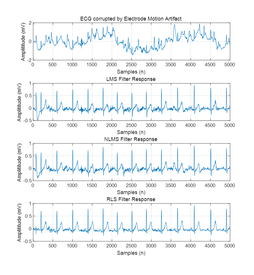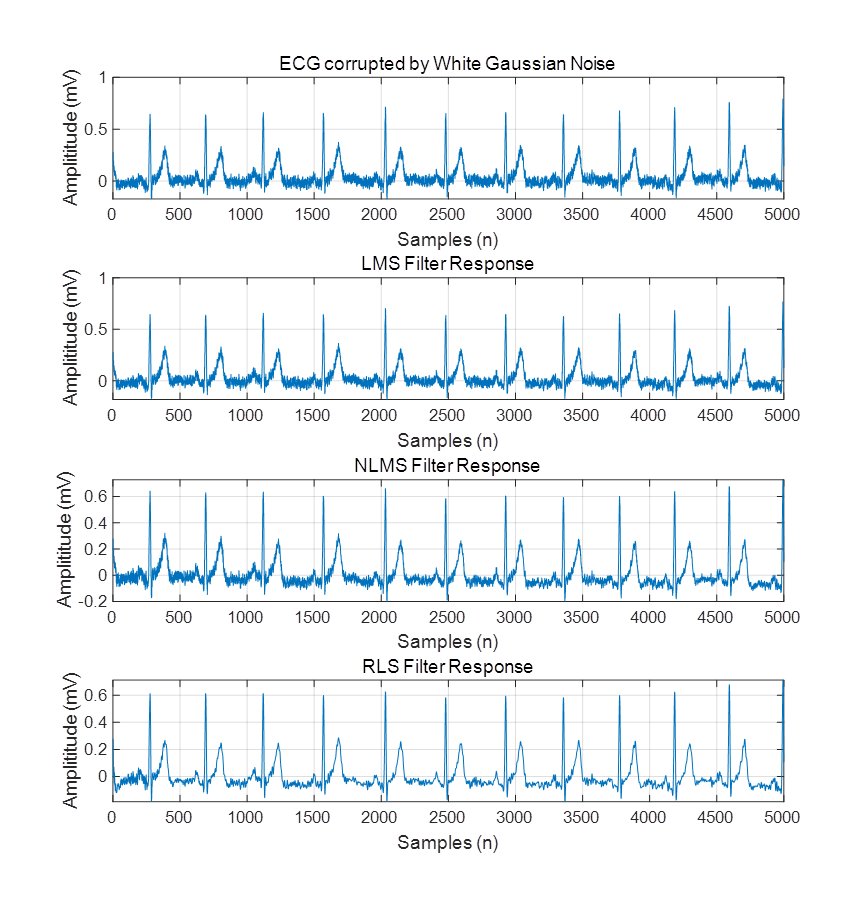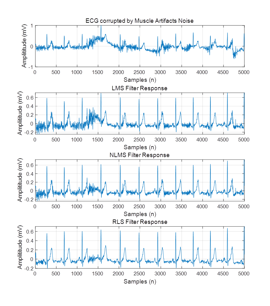 算法程序运行环境为MATLAB R2018a,采用最小均方算法,归一化最小均方算法和递推最小二乘法3种自适应滤波器对ECG信号进行噪声消除,噪声包括基线漂移噪声 (BWN)、电极运动噪声 (EMN) 、肌肉伪影噪声 (MAN)、高斯白噪声(WGN)和60 Hz电力线干扰(PLI)噪声。