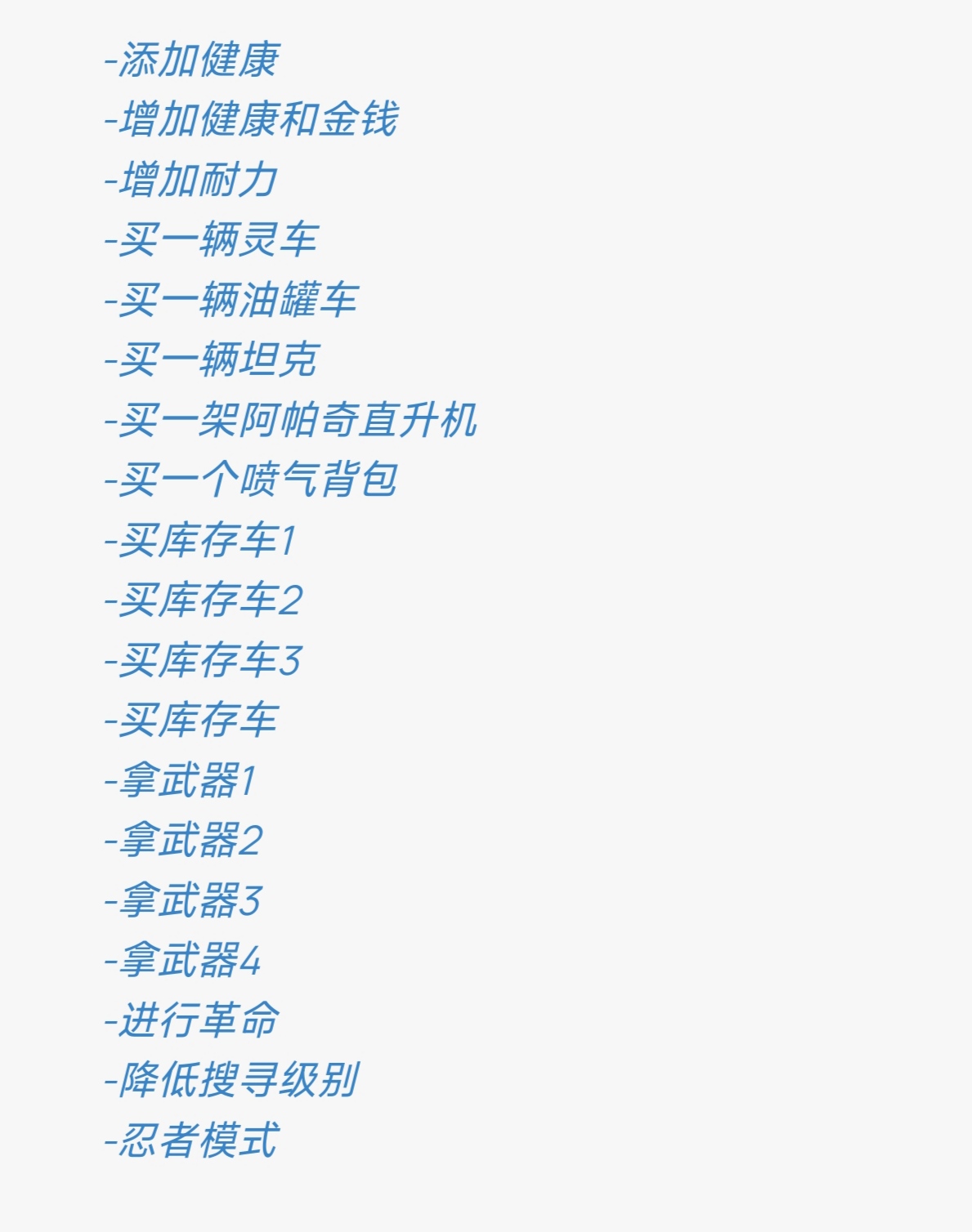 MOD3为:80种作弊功能版本,包含刷车,刷武器,跳过任务,天气等等等作弊(SA2.10汉化版)
