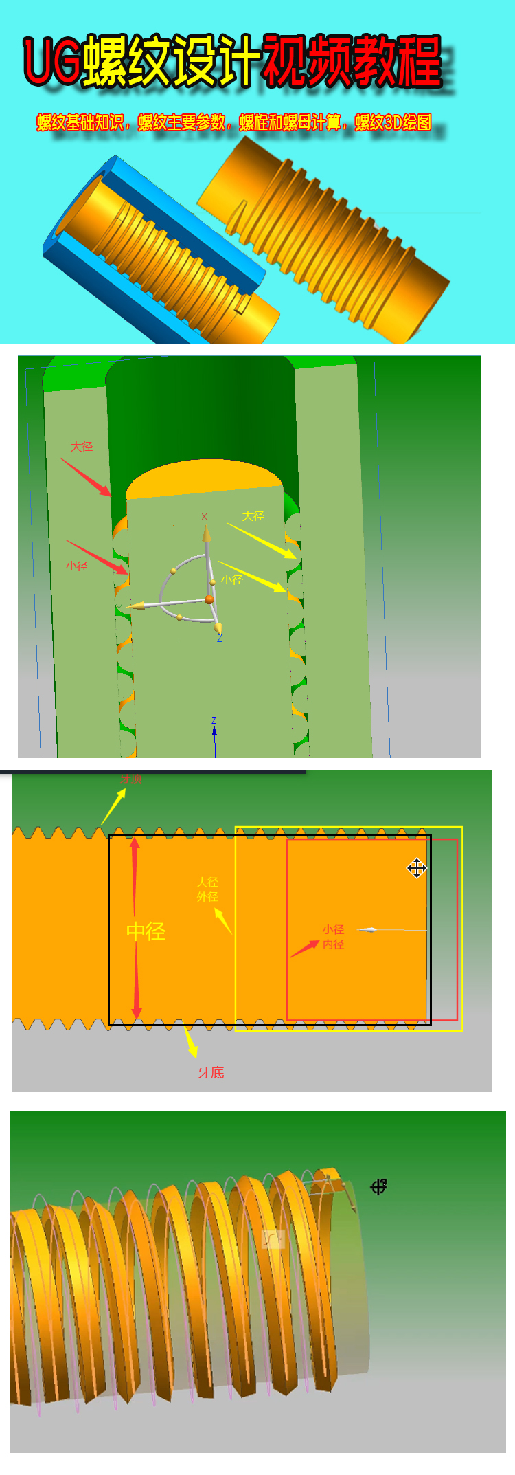 本教程从螺纹的基础向深入详细讲解工业产品中螺纹的设计知识,从基本参数,螺栓,螺纹,螺纹大径,螺纹小径,螺栓与螺母之后的组合关系,渐消螺纹画图方法,螺纹各项参数的计算方式,螺公与螺母之后的生产避空设置等。让学员理解螺纹的知识之后,再到螺纹的实际设计画图,使用专业软件绘制可用于生产的3D螺纹图档,可以出STP格式,IGS格式,STL格式等,可以用于模具应用或者3D打印样板。使用此教程做好的螺纹文件也可以导出STP或IGS格式到PRE/O,SOLIDWOR,犀牛等工业软件里进行使用。