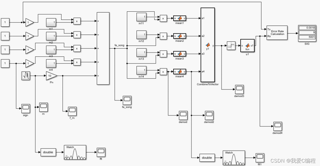 由上图可知,这个系统一共有两个模块组成——调制模块和解调模块。其中调制模块是信号发生器产生4路输入信号,经WALSH调制、PN扩频、基带求和与并/串变换成为1路信号,完成调制。而解调模块主要是将收到的1路信号首先进行串并转换,在取得同步的基础上进行PN解扩和WALSH解调从而恢复出4路信息。该系统框图就是我们所要实现的系统的基本结构,具体实现方法、步骤、以及原理分析及优化我将针对每个模块,在后面给予具体研究。