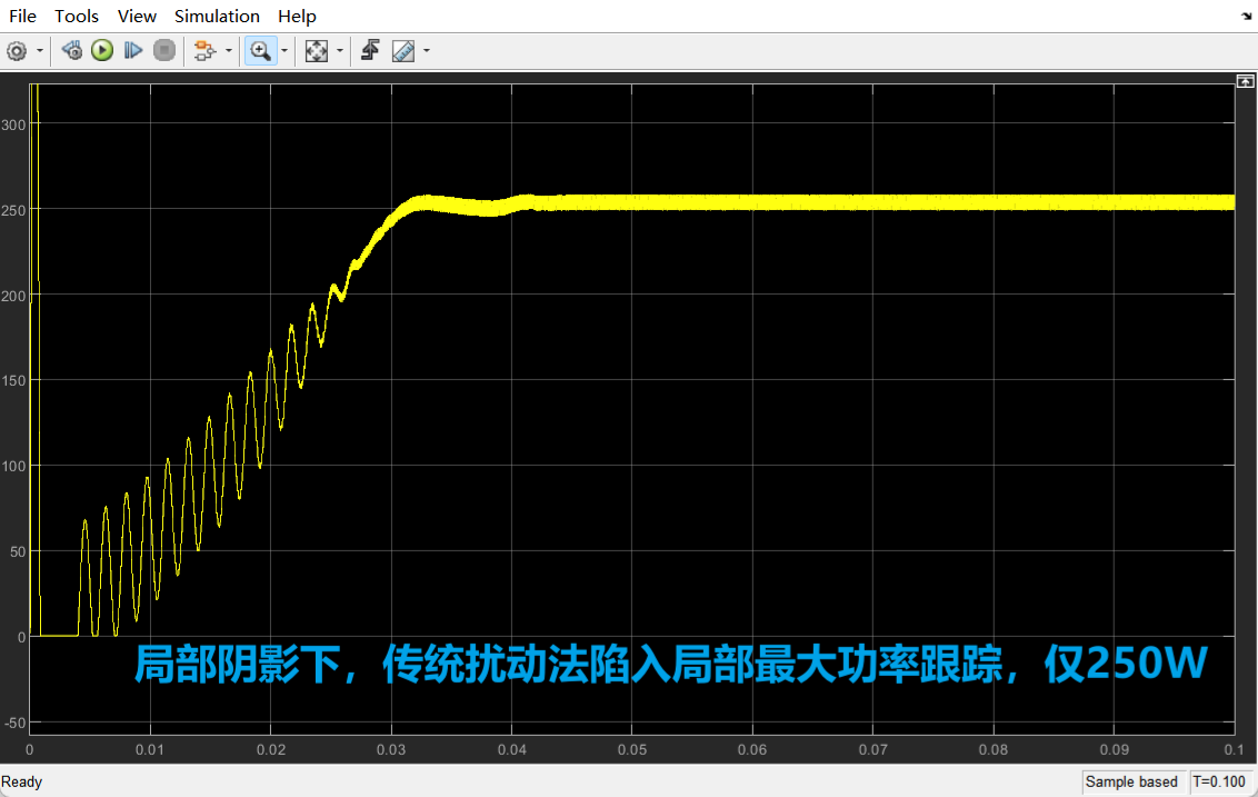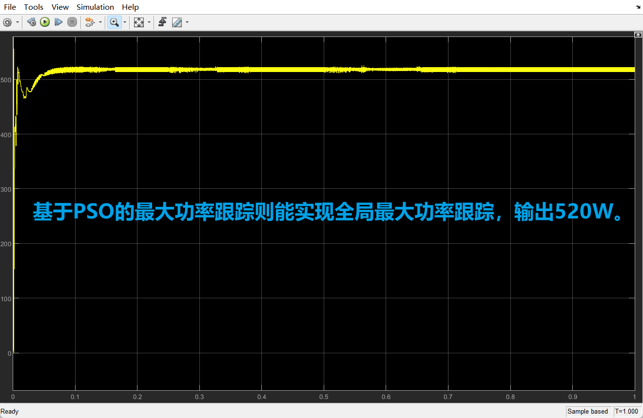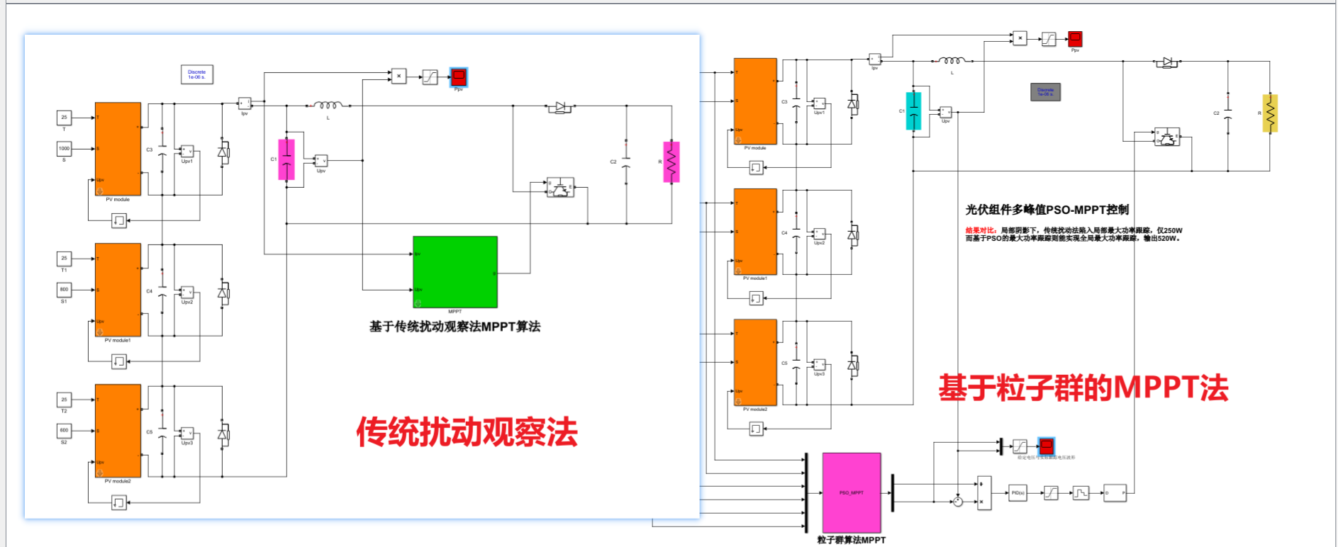 5、结果对比:局部阴影下,传统扰动法陷入局部最大功率跟踪,仅250W,而基于PSO的最大功率跟踪则能实现全局最大功率跟踪,输出520W。
