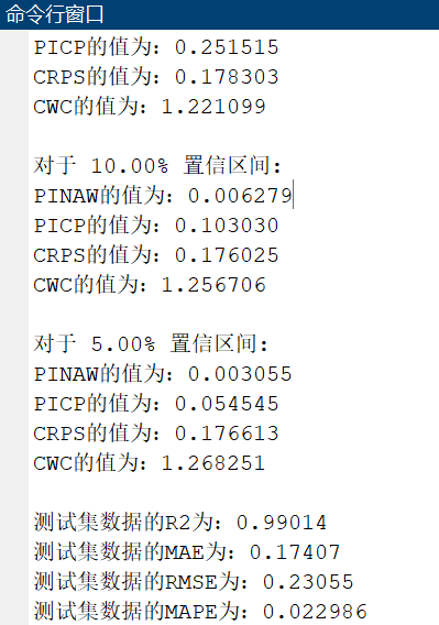 可以看到,在本数据集上,精度是非常高的,R2也达到了0.99以上,与真实值基本吻合,区间预测和点预测的指标也非常全面,非常适合用来作为创新点!