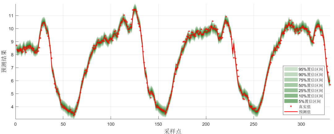 利用刚刚的数据集,这里设置种群数量为10,优化算法最大迭代次数为20,展示一下运行效果。同时,设置置信区间分别为95%、90%、75%、50%、25%、10%、5%,得到的预测结果如下所示(由于CEEMD、优化算法、ELM算法均具有随机性,因此每次运行结果会略有不同,属于正常现象):