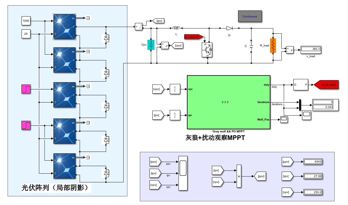 光伏MPPT灰狼算法改进扰动观察法、局部阴影寻优最大功率点仿真(有参考资料)