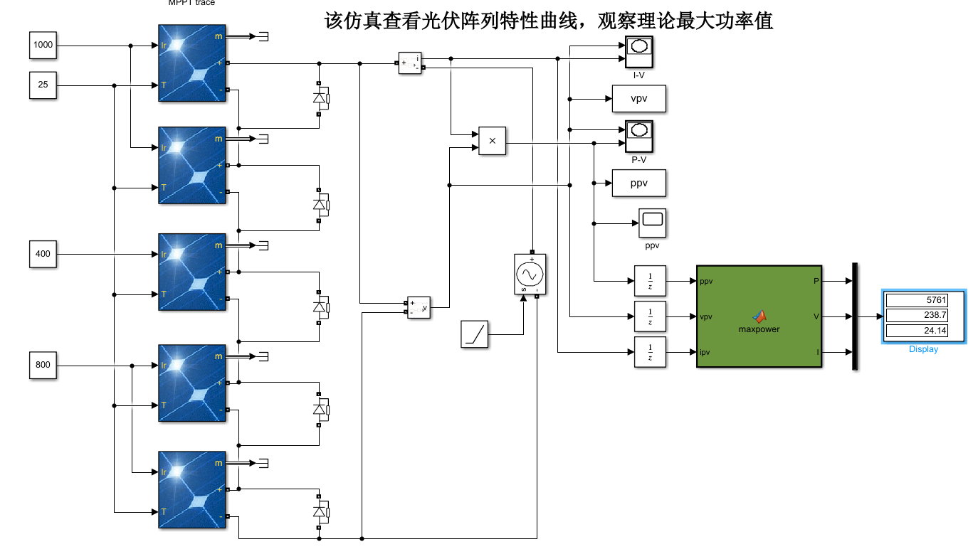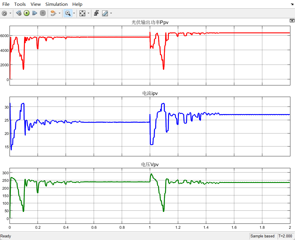 3、仿真工况:在1秒时,设置光伏阶跃以模拟局部阴影情况