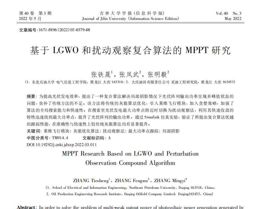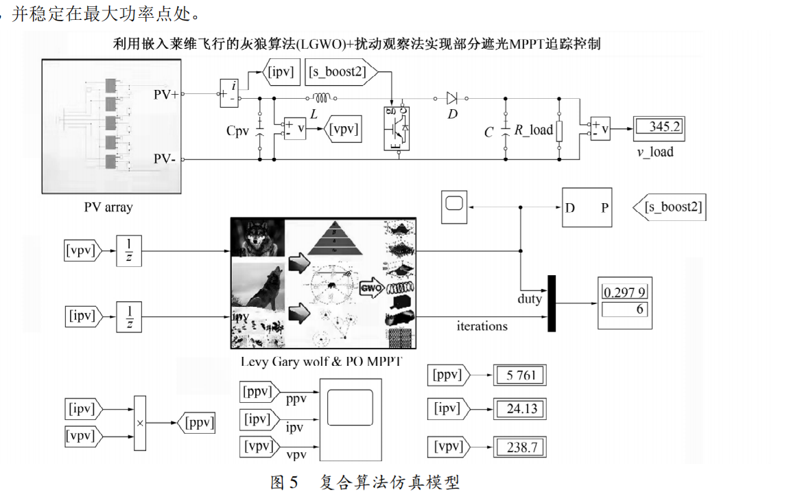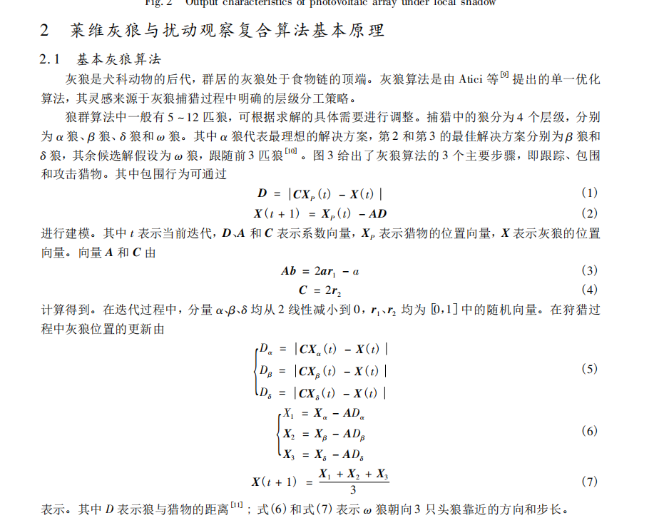 1、改进灰狼扰动观察法:将灰狼算法与扰动观察法相结合的复合控制算法,利用灰狼算法的全局搜索能力定位最大功率点的范围,然后进行局部搜索,找到精确的最大功率点。扰动观察法在局部阴影条件下陷入了局部最优解,没有追踪到最大功率点。