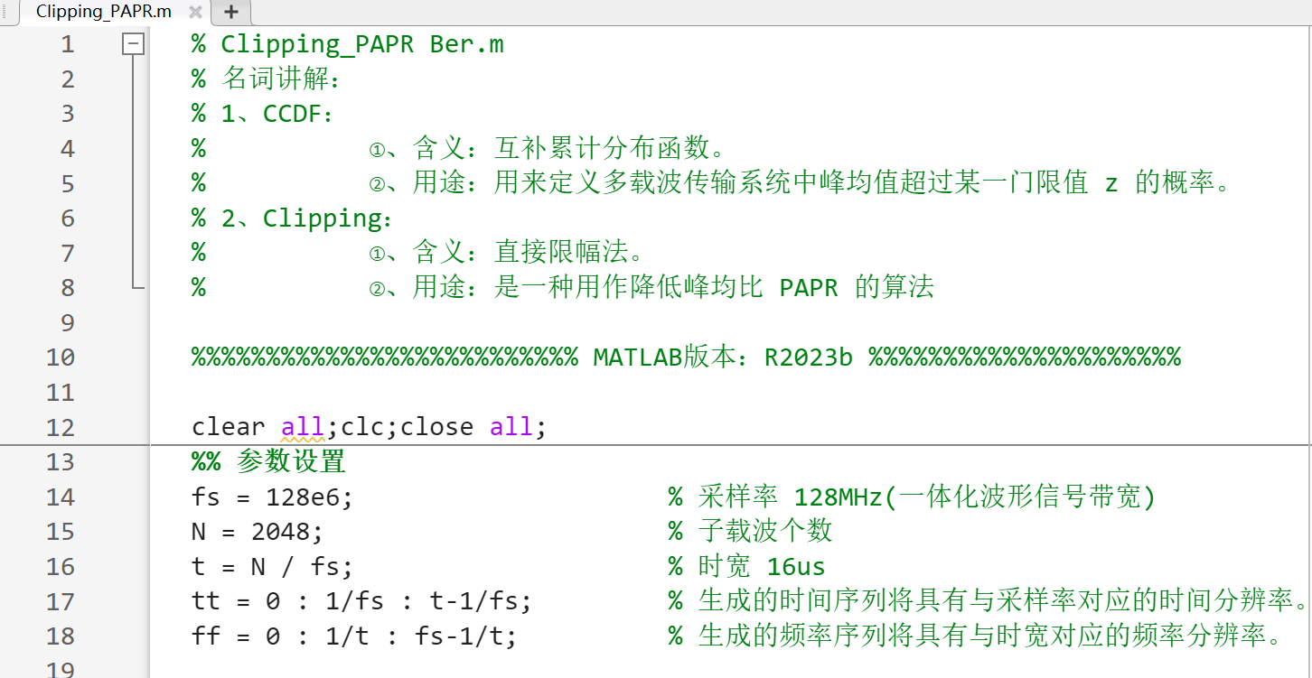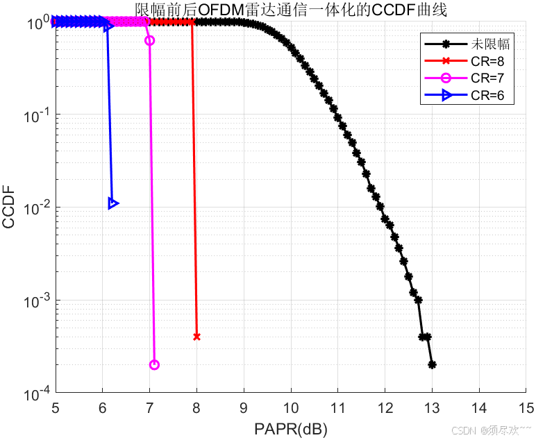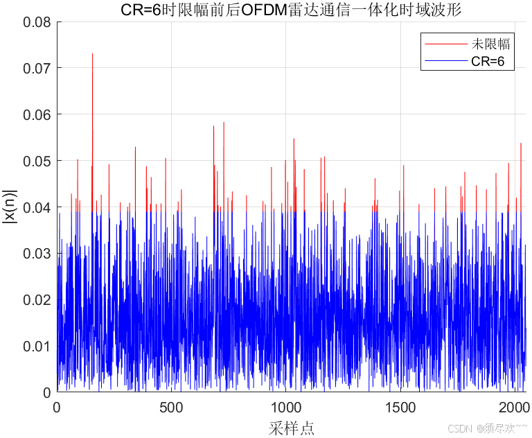 在 OFDM 雷达通信一体化系统中,信号的传输由多个子载波协同完成,多个载波信号相互叠加形成最终的发射信号。此叠加过程可能导致信号峰值显著高于其均值,从而产生较高的峰值平均功率比(PAPR)。当这些具有高 PAPR 的信号通过非线性设备时,若信号的峰值超出设备的动态范围,就可能引发信号失真,从而影响系统性能。因此,OFDM 雷达通信一体化系统对非线性设备的动态范围提出了较为严格的要求,显著增加了系统建设成本。OFDM 技术所面临的高峰均比问题,已成为其在实际应用中遭遇的主要障碍之一。为了抑制 PAPR,多种技术被提出,本文介绍使用直接限幅法抑制 OFDM 的 PAPR。