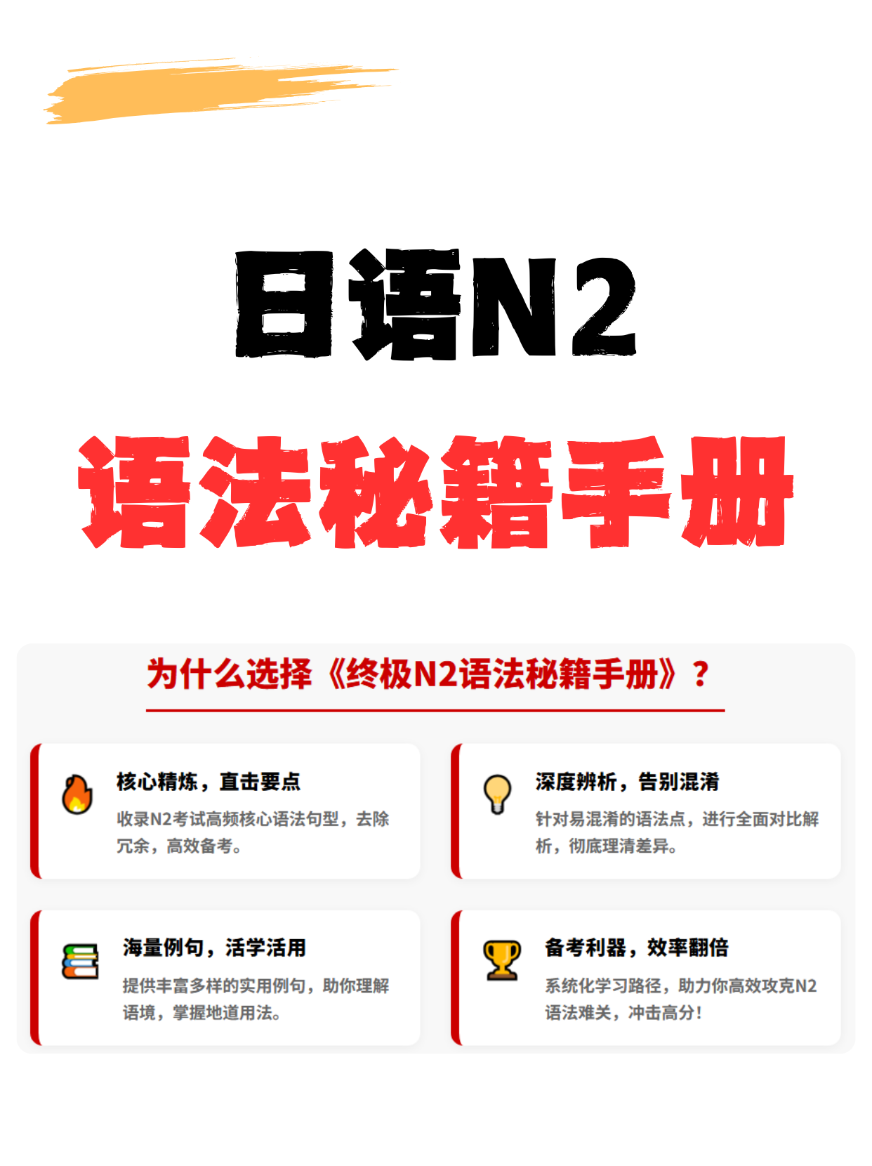 内容精炼,高效直击考点: 传统语法书常内容繁杂、冗余,而本手册精选N2考试高频核心语法句型,旨在帮助学习者高效备考,直击考点,避免无效学习 。