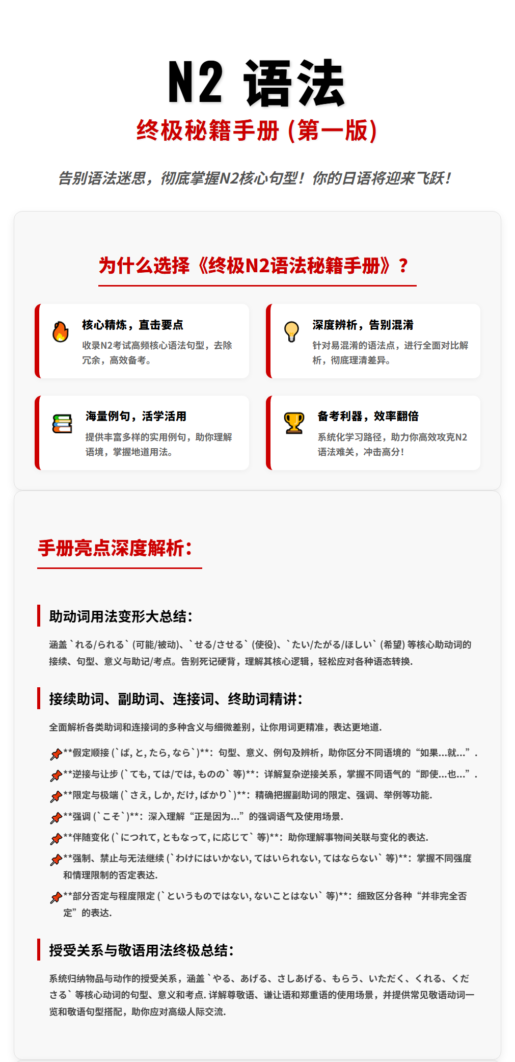 系统化学习路径,备考效率翻倍: 本手册涵盖了助动词、接续助词、副助词、接续词、终助词、补助动词、授受关系和敬语用法等多个语法模块,构建了系统的学习路径,有助于学习者高效攻克N2语法难关,提高备考效率 。