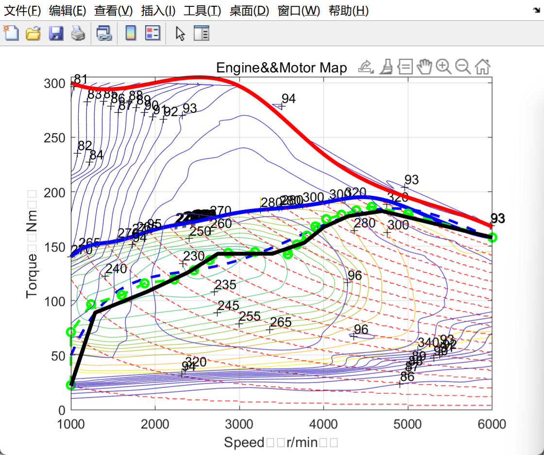(1)输出发动机MAP与电动机MAP图绘制两者组合效率最优曲线。