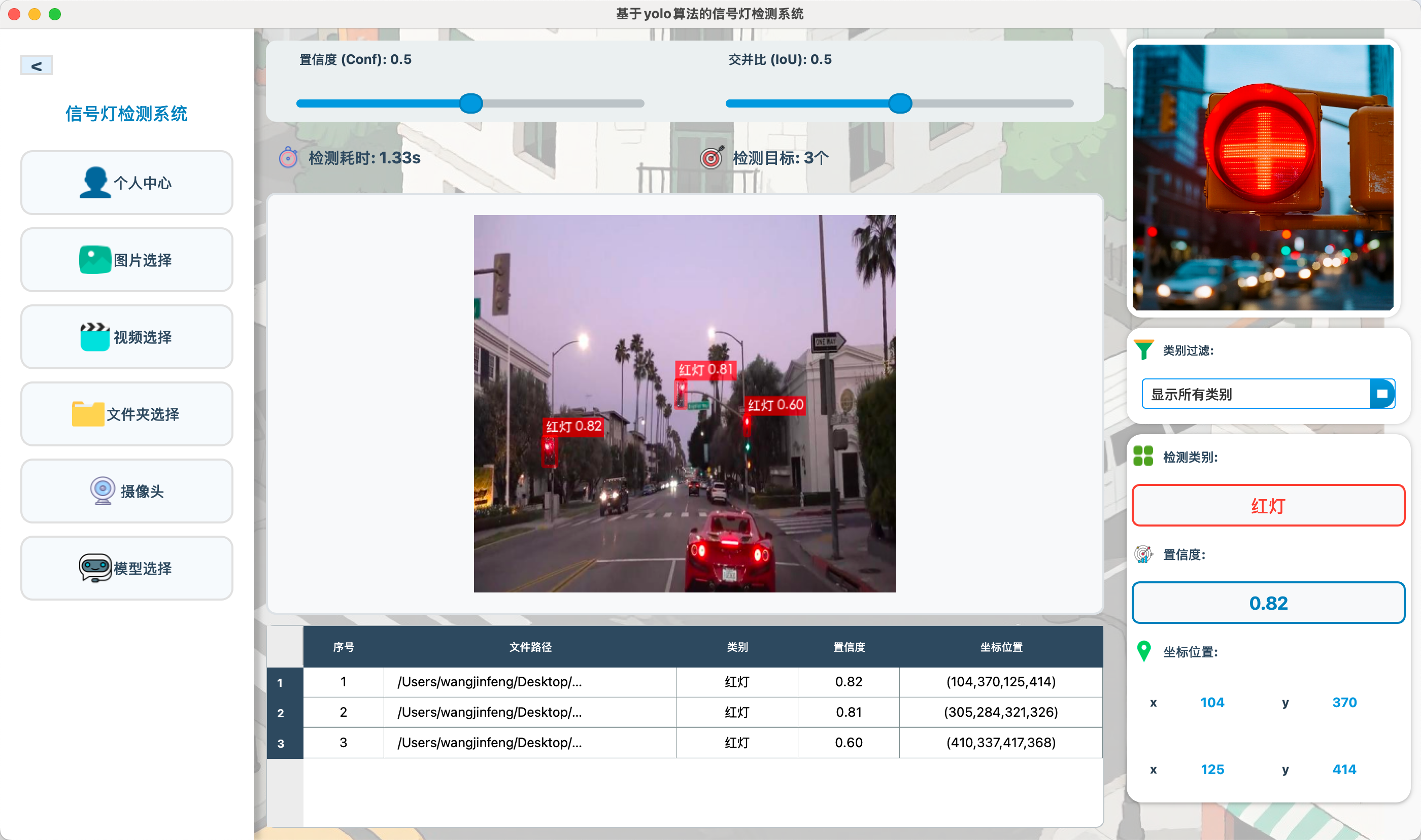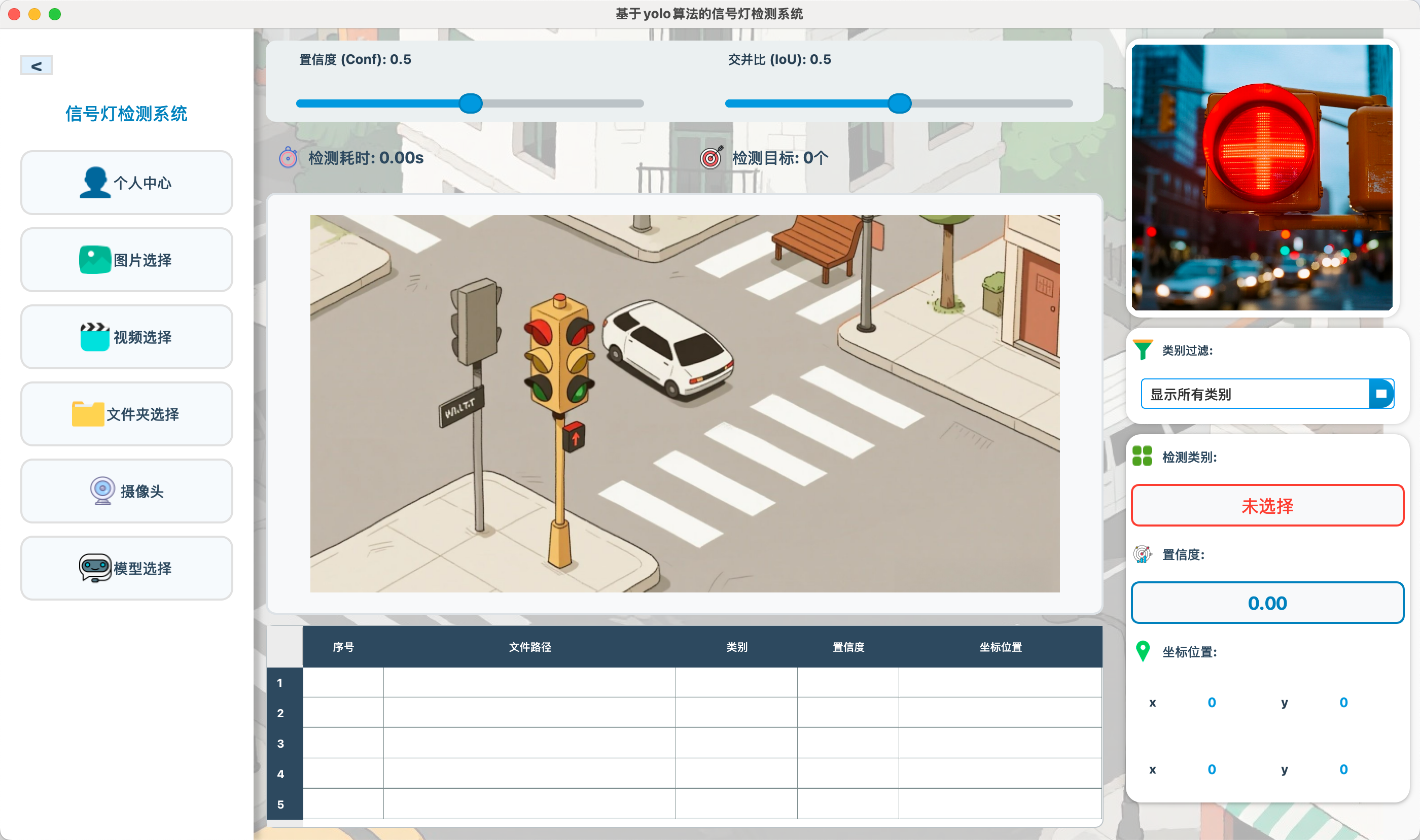 功能:基于yolo算法的交通信号灯识别系统,系统集成了yolov11的模型,界面采用pyqt5进行制作,系统可以对单个图片、文件夹批处理、视频、摄像头进行实时识别处理。并将识别的结果实时展示到界面上,包括检测的时间、置信度、结果、坐标等信息,同时还包括训练用到的数据集,包括数据集对应的标注文件,还有模型的训练代码,也可以自己运行训练代码进行二次训练。系统还包括用户登陆注册界面,还有无需界面运行的执行脚本,方便不同需求的场景使用研究。