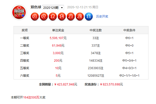 双色球第2020126期开奖:03 07 12 14 23 28 + 11,其中红球和值为87,首尾间距为25,大小比为2:4,三区比为2:2:2,012路比为2:2:2,奇偶比为3:3,蓝球开出2路号码。