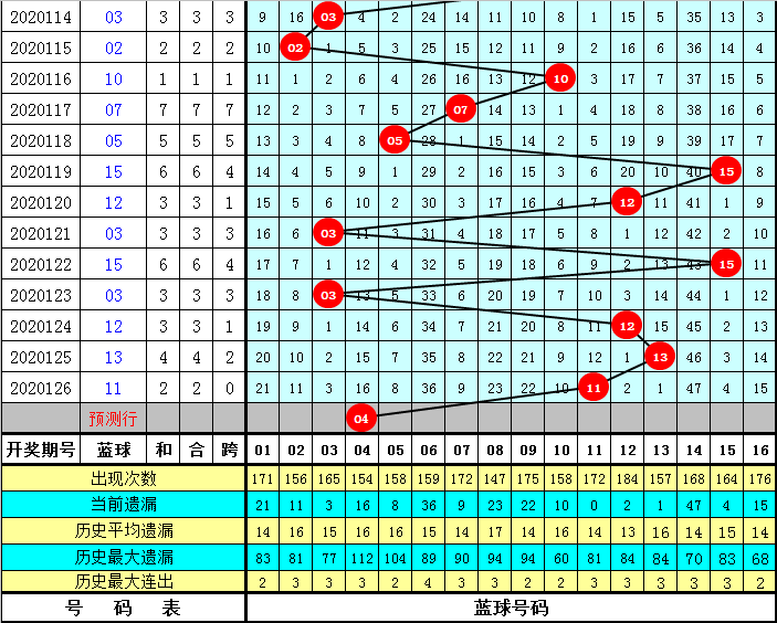 蓝球分析:上期蓝球号码为11,间隔12期再出,为温码蓝球,目前蓝球号码01-16遗漏期数分别为:21期-11期-3期-16期-8期-36期-9期-23期-22期-10期-0期-2期-1期-47期-4期-15期,本期重点参考冷码蓝球解冻,独蓝参考04。