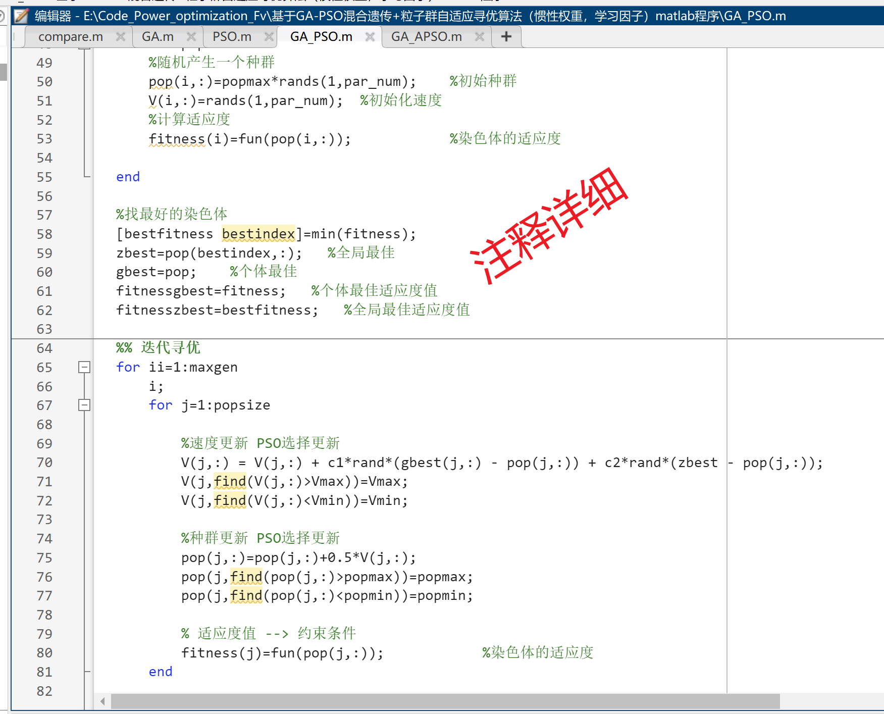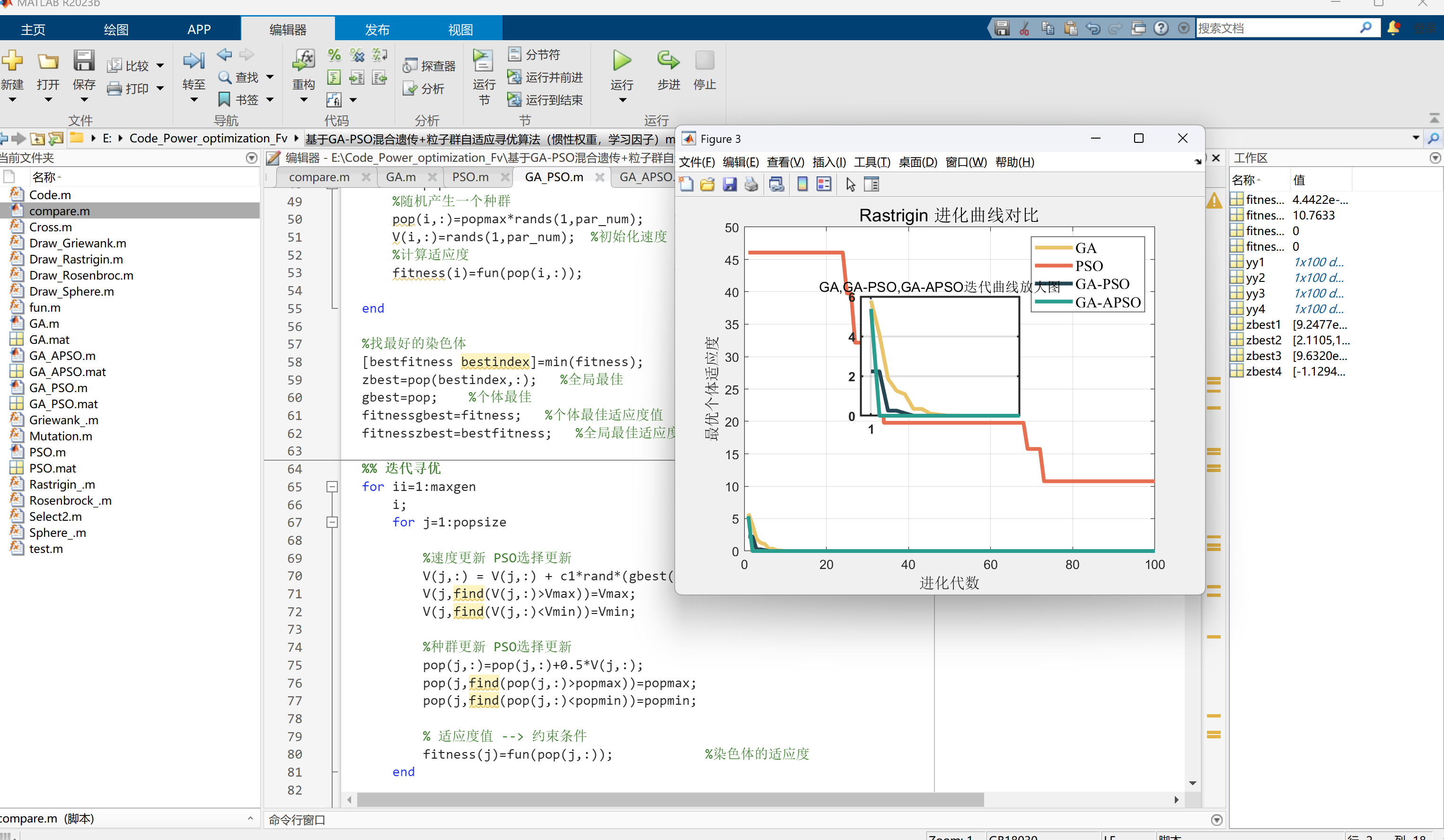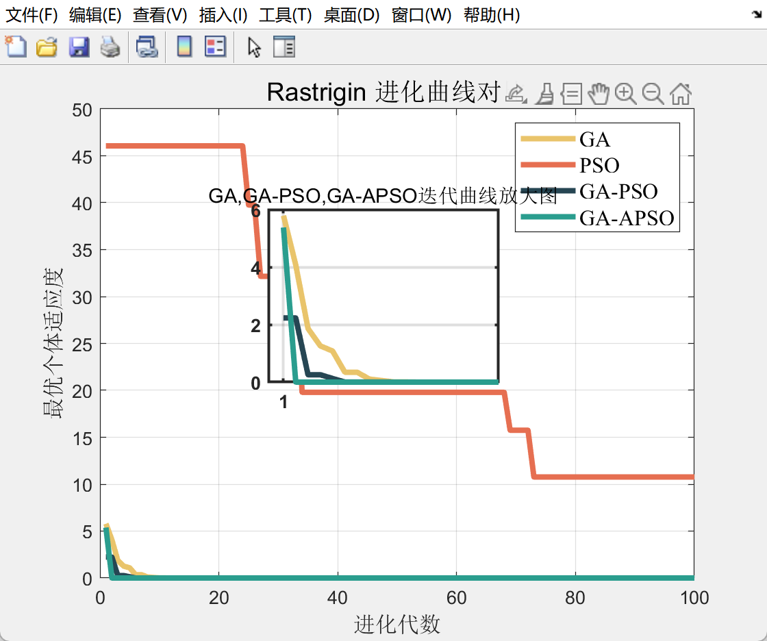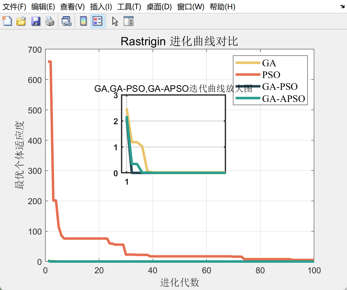 基于GA-PSO混合遗传+粒子群自适应寻优算法(惯性权重,学习因子)matlab程序(四种算法迭代对比)