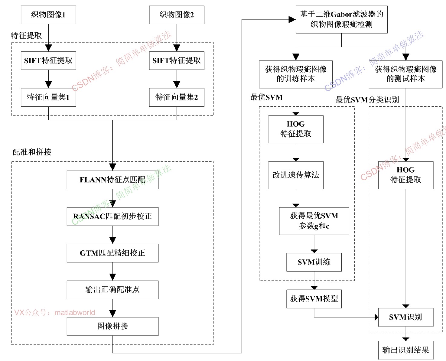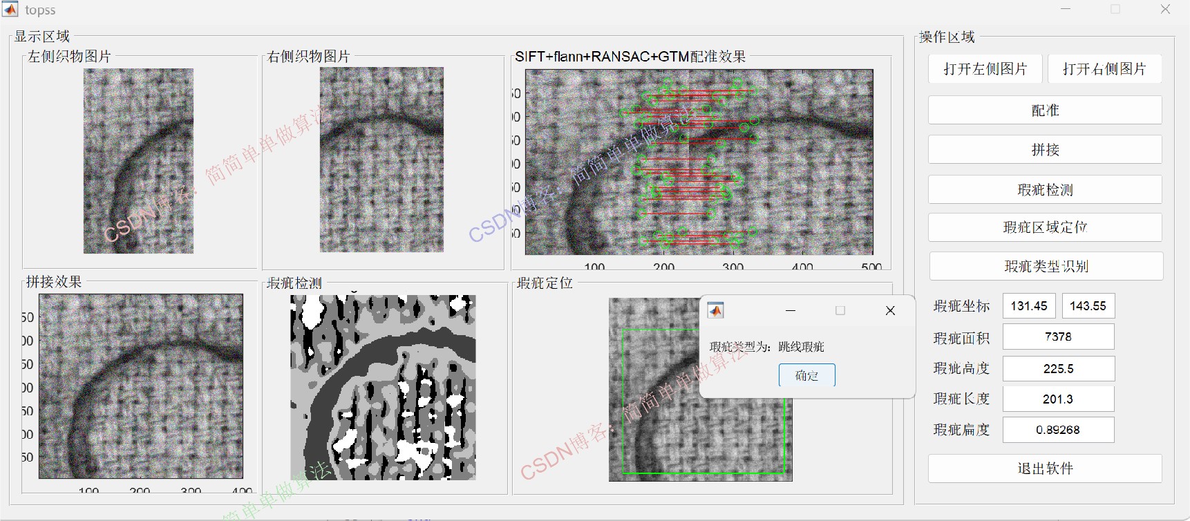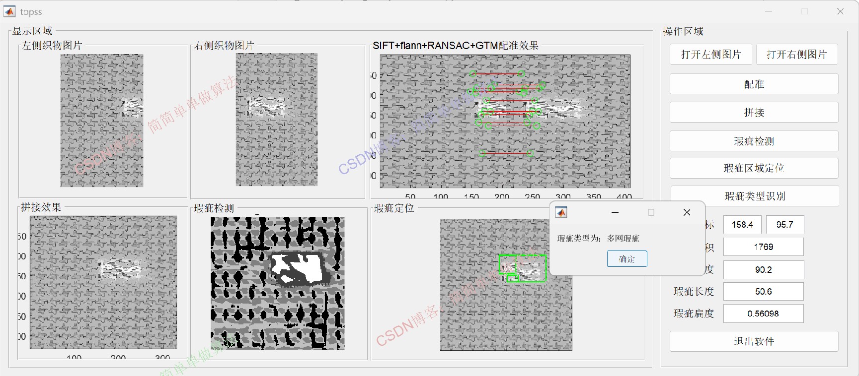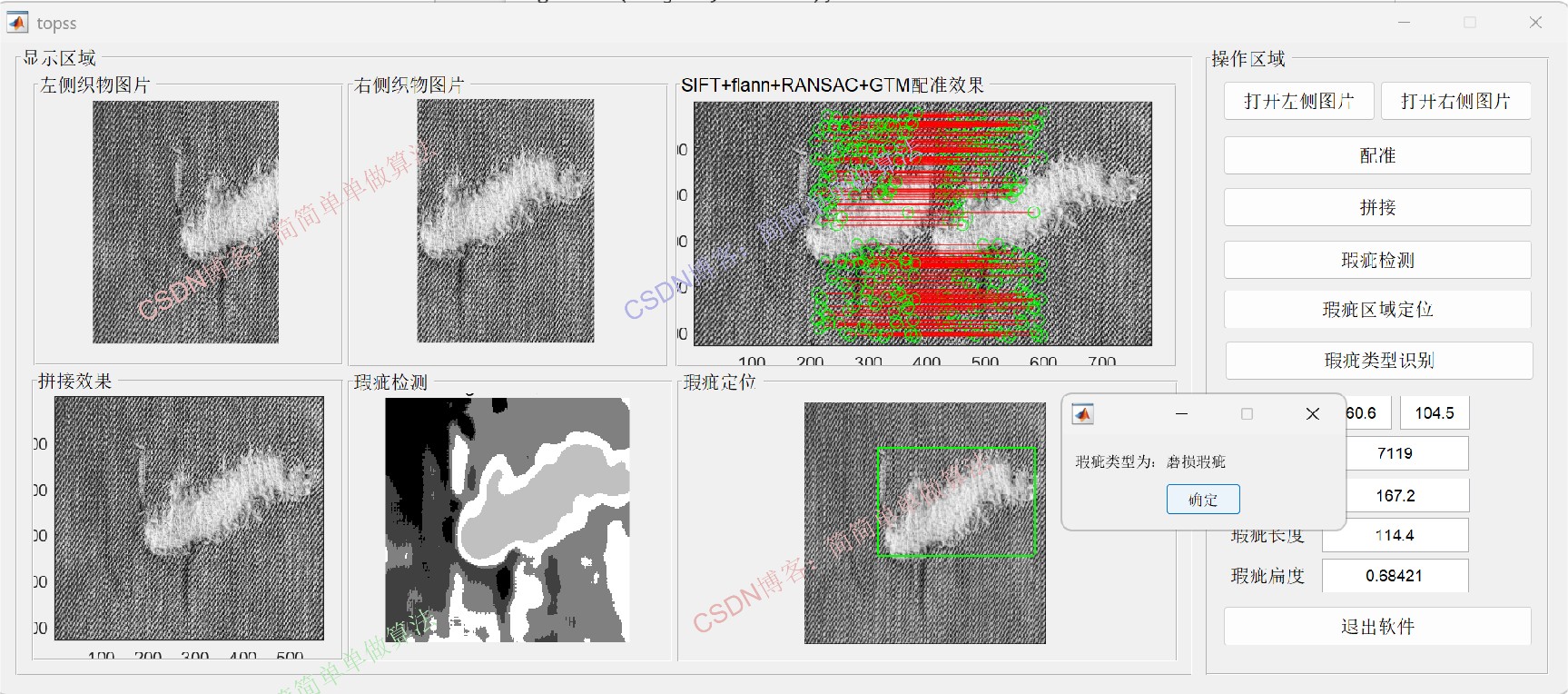 基于GA-SVM的织物瑕疵种类识别算法matlab仿真。输入织物图像,首先通过SIFT+flann+ RANSAC+GTM算法对织物图像进行拼接,然后通过garbor算法提取瑕疵区域,最后通过遗传优化SVM对织物瑕疵类型进行识别。