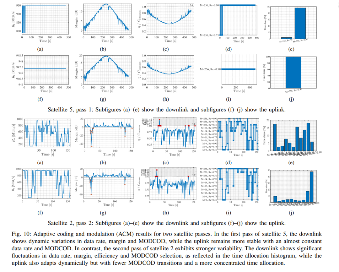 本文展示了两个对比鲜明的案例研究:一是稳定过境场景,上下行链路均持续保持最高速率的调制编码方案(约 947 Mbit/s);二是衰落严重的过境场景,深度衰落导致调制编码方案频繁切换,吞吐量持续下降。结果表明:(1)旁瓣与大气辐射的耦合会显著提高下行链路噪声温度;(2)上行链路向冷空间的能量泄漏会降低卫星接收机的有效温度;(3)适度的滞后特性可在不牺牲吞吐量的前提下避免模式振荡。该框架支持参数扫描,且能纳入实测硬件参数以匹配实际运行系统,为动态链路评估和切换策略设计提供了实用基础。