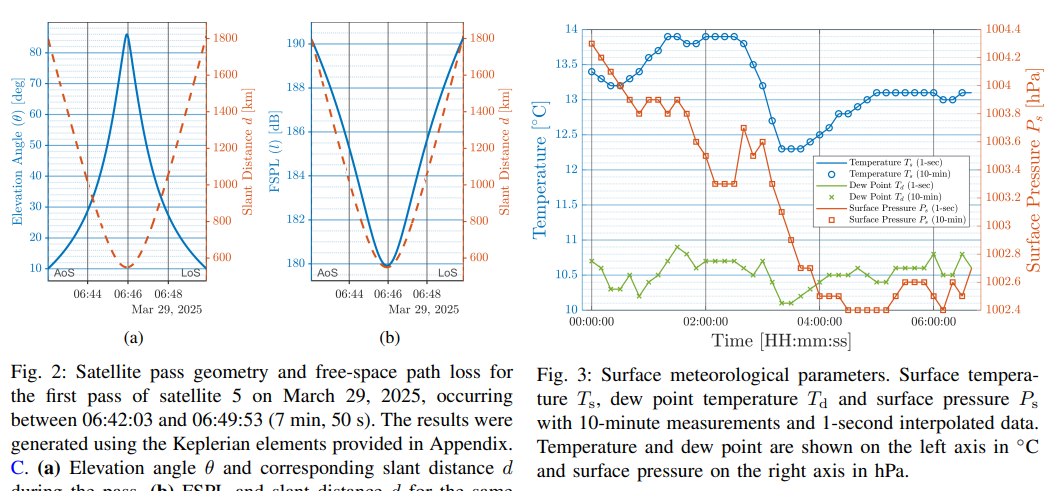 在前期研究 [9] 中,研究团队构建了一个框架,用于仿真 2025 年 3 月 29 日 5 颗低轨卫星的轨道轨迹。选择该日期是为了匹配地面站点的实测气象数据 —— 该气象站距离仿真地面站约 1.77 公里,位于北纬 38.23444°、东经 21.74333°,与仿真地面站(北纬 38.21868°、东经 21.74641°)海拔相近,由 Giorgos Chronopoulos 先生与雅典国家天文台合作运营 [10][11]。